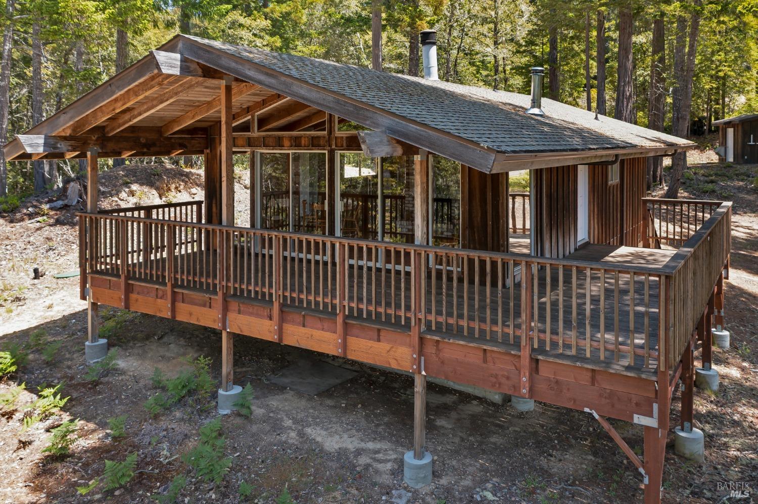 Privacy, trees, and only the sound of the breeze in the trees and the birds. It's rare to have a solid house and still be off-the-grid. 2 bedrooms/1 bathroom, approximately 1200 SF. Large, open living area and kitchen. Although the house is currently not connected to the electrical grid or the generator, the house was designed and constructed ready for electricity in about 1973. Spacious living area, with the cathedral, open beam ceiling, floor-to-ceiling glass, and covered porch. The kitchen area is useable, but not completely functional. Propane runs the wall furnace, and on-demand hot water heater. Previously there was a propane refrigerator. The well pump is a part of the sophisticated system in an insulated shed with solar panel battery starter, automatic ventilation system, propane generator (Kohler 8.5 Res), 3000-gallon storage tank, and 3-stage water filter system. 10 acres +/- of trees, privacy, and distant views of the marine layer through the forest. Roseman Creek runs along the westerly edge of this property. Approximately 7 miles to the town of Gualala. Family-owned and loved for over 50 years, this is a heritage property that is only available once in a generation.