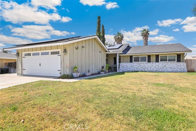 Move in ready single-story 4 bed/2 bath home in a wonderful Grand Terrace neighborhood. The interior has an open and spacious floor plan, lots of natural light, and has been highly upgraded with custom vinyl plank flooring, beautiful crown molding, and new interior paint. The remodeled custom kitchen features many updates including built-in space racks, built-in pots and pans storage, roll out pantry shelves, recessed lighting, quartz counters, subway tile backsplash, stainless steel appliances, a center island with breakfast bar seating and pendant lighting. There is also an in-kitchen dining area with a modern chandelier and a slider to the side yard. The Living Room offers a corner fireplace with custom herringbone pattern tile, a ceiling fan, and a slider to the backyard. The full-size hall bathroom has been upgraded with a quartz countertop with dual sinks. The 3 secondary bedrooms are large and the big Primary suite sits at the end of the hall and has carpet floors, a gorgeous light fixture, a slider to the backyard and a private full-size bathroom also with dual sink vanity. Enjoy the private backyard with covered patio, and there is also an attached 2-car garage. The roof is only 7 years old, and the solar system will be paid off through the sale!