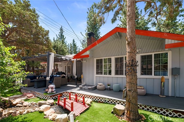 Welcome to this stunning remodeled 3 bedroom, 2 bathroom home in the Erwin Lake area of Big Bear City. This home has been carefully gutted and renovated in 2019, including a new roof, quartz countertops, and luxury vinyl plank flooring throughout. This home has charming curb appeal and modern interior finishes, making it perfect for those looking for a cozy retreat in the mountains. The open concept living area is ideal for entertaining guests or simply enjoying a quiet evening by the fireplace. The kitchen features stainless steel appliances, quartz counter tops, and ample cabinet space, making it a chef's dream. The master suite includes a luxurious en-suite bathroom with a walk-in shower, dual vanities, bidet, and walk in closet, adding a touch of luxury to your everyday routine. Step outside and unwind in the spa, or sit on the patio and enjoy the tranquil sounds of the waterfall complete with fish pond. Located just a short drive away from all that Big Bear has to offer, including skiing, the lake, shops, and restaurants, this home offers the perfect combination of relaxation and convenience. Whether you're looking for a weekend getaway or a year-round residence, this home offers the best of both worlds. With its convenient location and modern amenities, this home is truly a