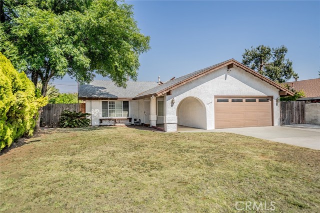 Welcome to this single-level 3-bedroom, 2 bath, single-story home with 1,144 sq ft on a large flat lot of 10,019 sq ft and located on a cul-de-sac. You are welcomed with a long covered walkway to the front door. Upon entry is the living room/dining room combo, both with ceiling fans, open to the kitchen with a slider to the patio room, which has a separate door to the alumna wood-covered patio. The primary bedroom has an ensuite bath with a walk-in shower. Two bedrooms share the secondary bathroom with a tub/shower combo. Shutters on all bedrooms and living room. Two car garage with 3 spaces out front of which the 3rd space on right is perfect to park an RV or Trailer. Back yard has a huge flat pool size yard. Low taxes and no HOA.