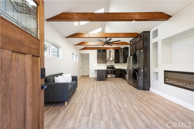 Introducing a pristine, never-before-lived-in 764 square foot detached Accessory Dwelling Unit (ADU) nestled in the heart of Fullerton. This thoughtfully designed home boasts modern elegance with vaulted ceilings, skylights, and an electric fireplace creating a warm ambiance. The fully equipped kitchen features Calcutta quartz countertops, new cabinets, and top-of-the-line appliances, including a stove and dishwasher. Enjoy the convenience of a washer and dryer, custom built-in entertainment unit, and wood plank ceramic tile flooring throughout. This ADU exudes luxury with custom awning windows, an exquisite mahogany front door, and solid core shaker interior doors. The aesthetic is complemented by champagne gold hardware and under/over accent lighting. Additional features include central air, a tankless water heater, and wifi keyless entry locks for added security. The property offers a separate address and electric meter, ensuring complete autonomy. Conveniently located on a private cul de sac, enjoy the tranquility while being in close proximity to downtown Fullerton, distinguished schools, freeways, and ample shopping. With two expansive driveways, parking is never an issue. Don't miss the opportunity to make this contemporary gem your new home.