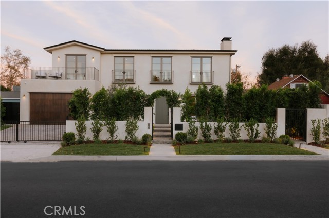 An extraordinary French Château–inspired estate, newly built and thoughtfully crafted, offering over 5,400 square feet of refined living space with 5 bedrooms and 5.5 bathrooms, set on a quiet street in the heart of Sherman Oaks. Built by Jacob Levy of Concept Renovations and designed by Caroline of Concept by C, the gated and private residence is framed by mature hedges and olive trees, featuring smooth stucco exteriors, wrought-iron detailing, European Mullan exterior lighting, and paver walkways. Interiors are light-filled and refined, showcasing wide-plank hardwood floors, custom cabinetry, soft interior arches, and seamless flow between formal living and dining areas and a spacious family room with built-ins, fireplace, and travertine stone accents. The chef’s kitchen is appointed with natural stone and marble surfaces, a large center island, custom cabinetry, walk-in pantry, and premium Miele appliances. The primary suite offers vaulted ceilings, patio access, and a spa-inspired bath with cheppo stone, Zellige tile accents, dual vanities, soaking tub, and glass-enclosed shower. Additional highlights include a movie theater with custom plaster walls, and a fully appointed ADU with its own living area, bedroom, and bathroom. Resort-style grounds feature a pool and spa, covere