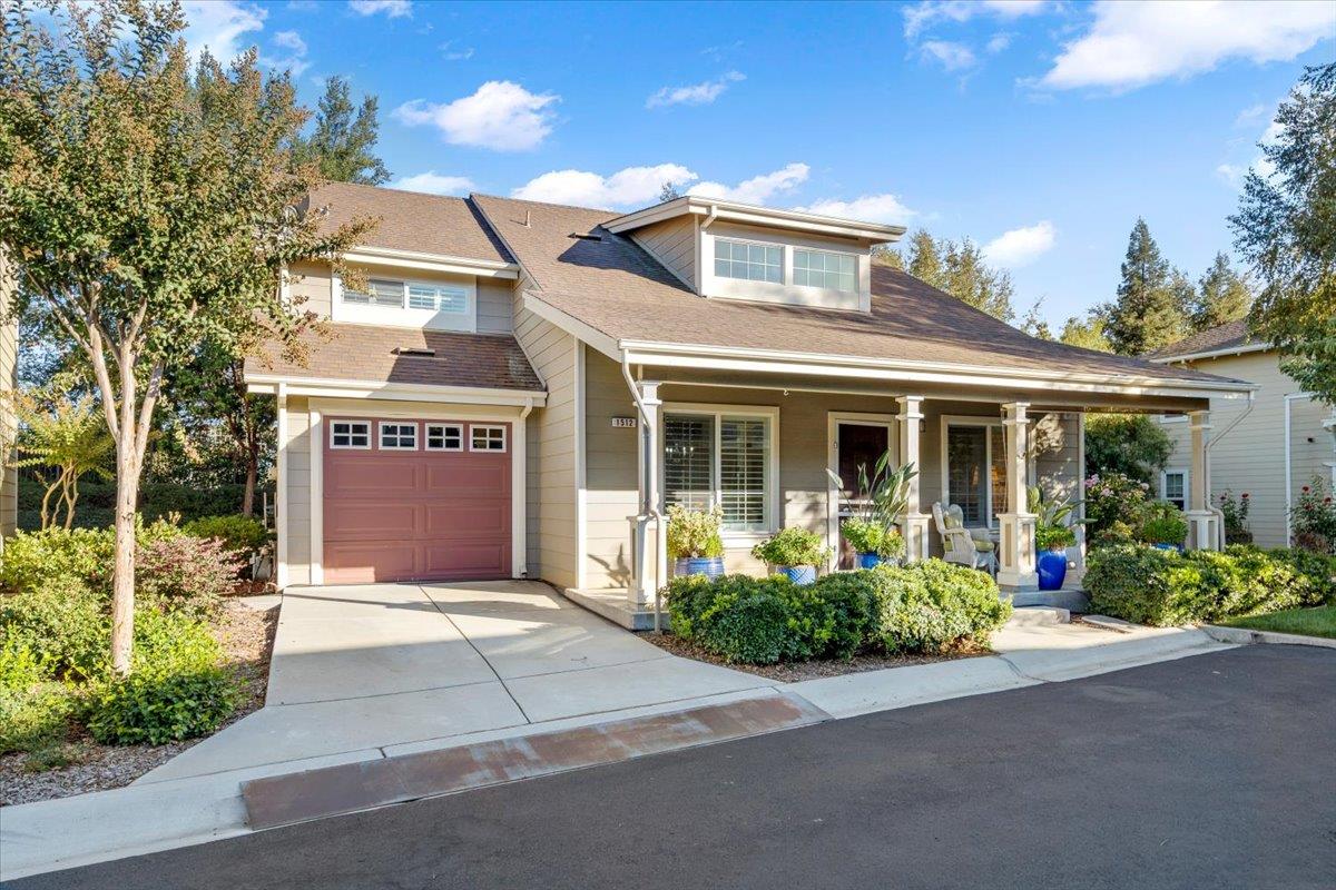 This is a lovely Seniors Community (62+). Vist this charming light and bright senior home and you will immediately appreciate the colorful spacious front porch with sun shade. Inside you will find soaring ceilings and a move in condition home. The great room and dining area adjoin a kitchen with granite counters, breakfast bar and included refrigerator. The doownstairs primary suite with spacous bath has access to charming back yard patio with fountain and remote controlled retractable canopy. Upstairs are two additional spacious bedrooms and another full bath. Luxury vinly planking flooring, plantation shutters, granite counters, Single stall garage with auto opener and additional storage. Laundry area in garage and washer and dryer are included. Motion sensor lights at front and back, ring doorbell, interior fire sprinklers.