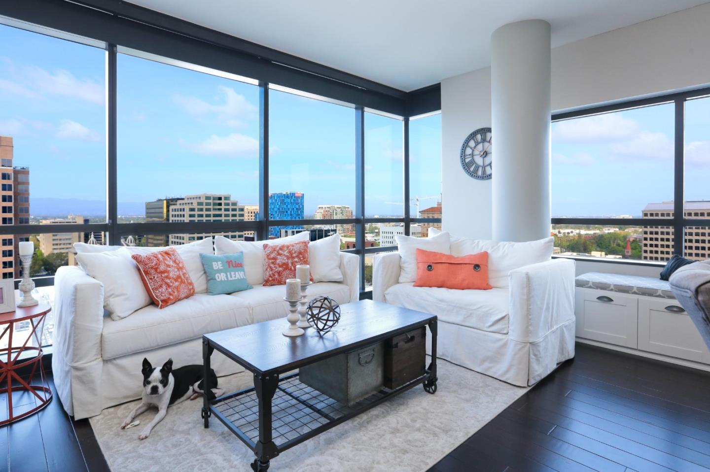 Must See. Corner unit with stunning views. Personal Tesla Charger. Everything has been updated. Stone and brick accent walls, upgraded full height kitchen cabinets and counters, motorized window blinds with smart controllers, accent LED lighting, custom counter-height island table, and more. Gas KitchenAid Range/Oven, Bosch dishwasher. Enjoy two parking spaces, with one space ready to charge your Tesla at 220/60amp speed. The 88 is San Jose's Luxury Highrise Condominium destination. Walk to all of your favorite spots. Scooter anywhere. Or stay at home, work out in the state of the art fitness center, enjoy the beautifully appointed entertainment room for your larger parties, pool and spa, BBQ area, billiard room and rooftop Skydeck. Amazon is literally next door for same day orders and returns. San Jose State Campus and Main Library are a block away. Perfect for walks. Shown by appointment only.