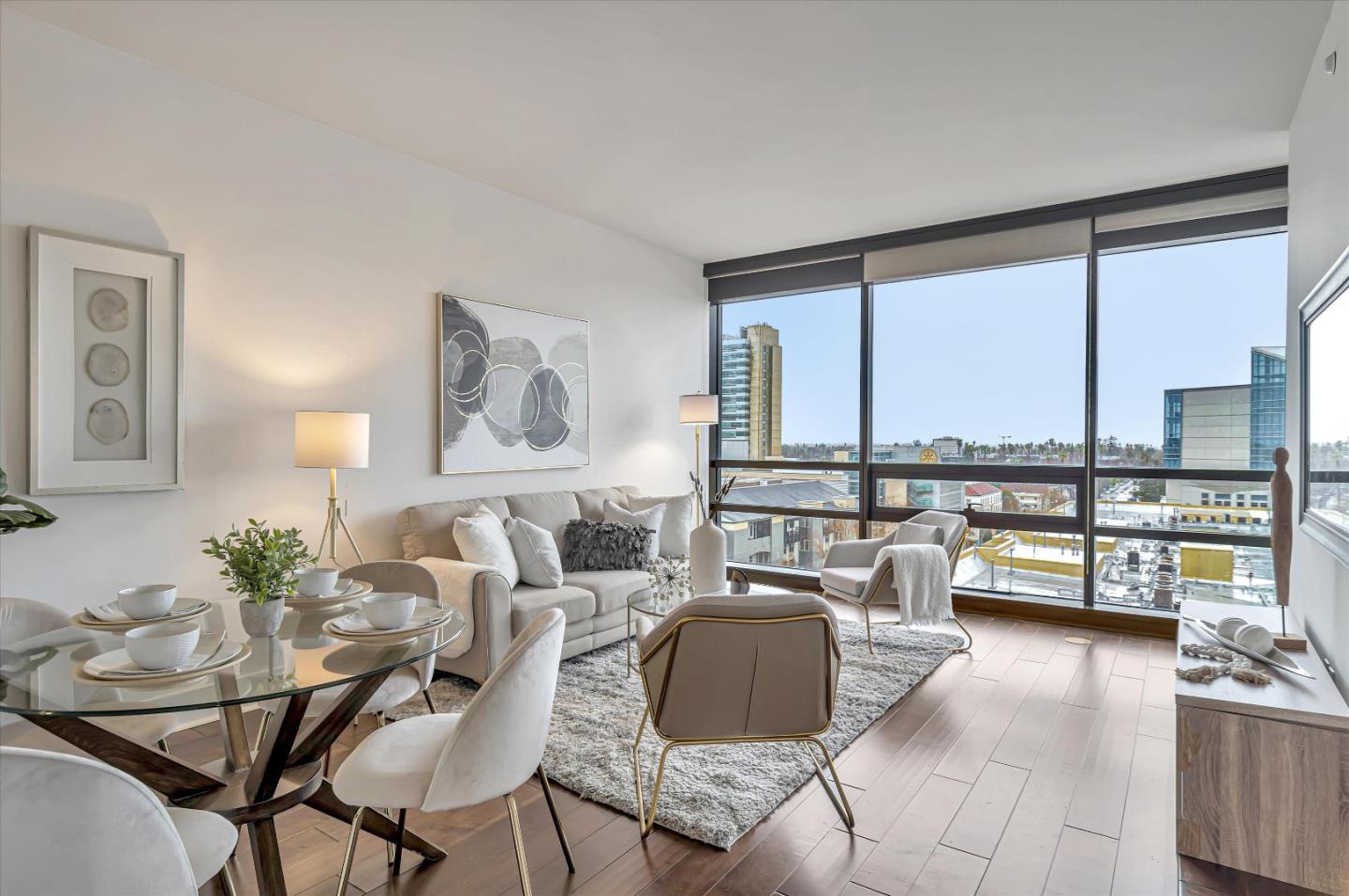 Introducing the most sought-after floor plan in the luxurious, amenity-rich landmark building in downtown San Jose, the88. This 1 bed, 1 bath floor plan doesn't come on the market often, because of its great layout, ample closet space, and, of course, floor-to-ceiling windows with unparalleled views of the (snow covered!) eastern foothills. This home features an entryway with a large deep closet and U-shaped kitchen with Barbosa cabinets providing ample storage, granite countertops, a breakfast bar, and stainless steel appliance package. The open-concept living and dining room has rich hardwood floors, both modern and cozy at the same time. The generously sized bedroom has plush carpet and two generous sized closets with upgraded organizers. The large bathroom has a deep tub, Caesarstone countertops, and double sinks. The unit includes a washer and dryer as well as 1-car deeded parking in the building's garage.