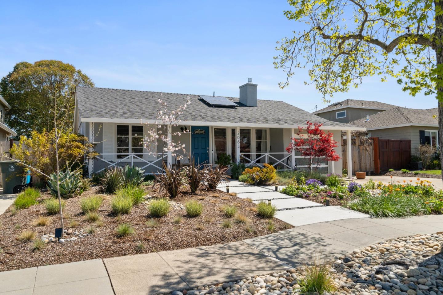 2063 Oregon Avenue, Redwood City, is a stylish cottage-style home with three bedrooms and two bathrooms in the desirable Woodside Plaza neighborhood. The house features a cozy living room, a spacious updated kitchen, an attached one car garage with a nice laundry area and lots of storage and a sunny dining area that opens up to a beautiful garden. The primary bedroom looks out at the garden and features a marble tiled bathroom with large shower. Two other sunny bedrooms and a newly renovated bathroom complete this home. The garden includes a large patio for entertaining, grass play area, fruit trees, raised beds for growing vegetables and herbs and an adorable chicken coop. In addition to the main house, there is a bonus building on the property that has permitted plans to become a 1 bedroom 1 bath Accessory Dwelling Unit.