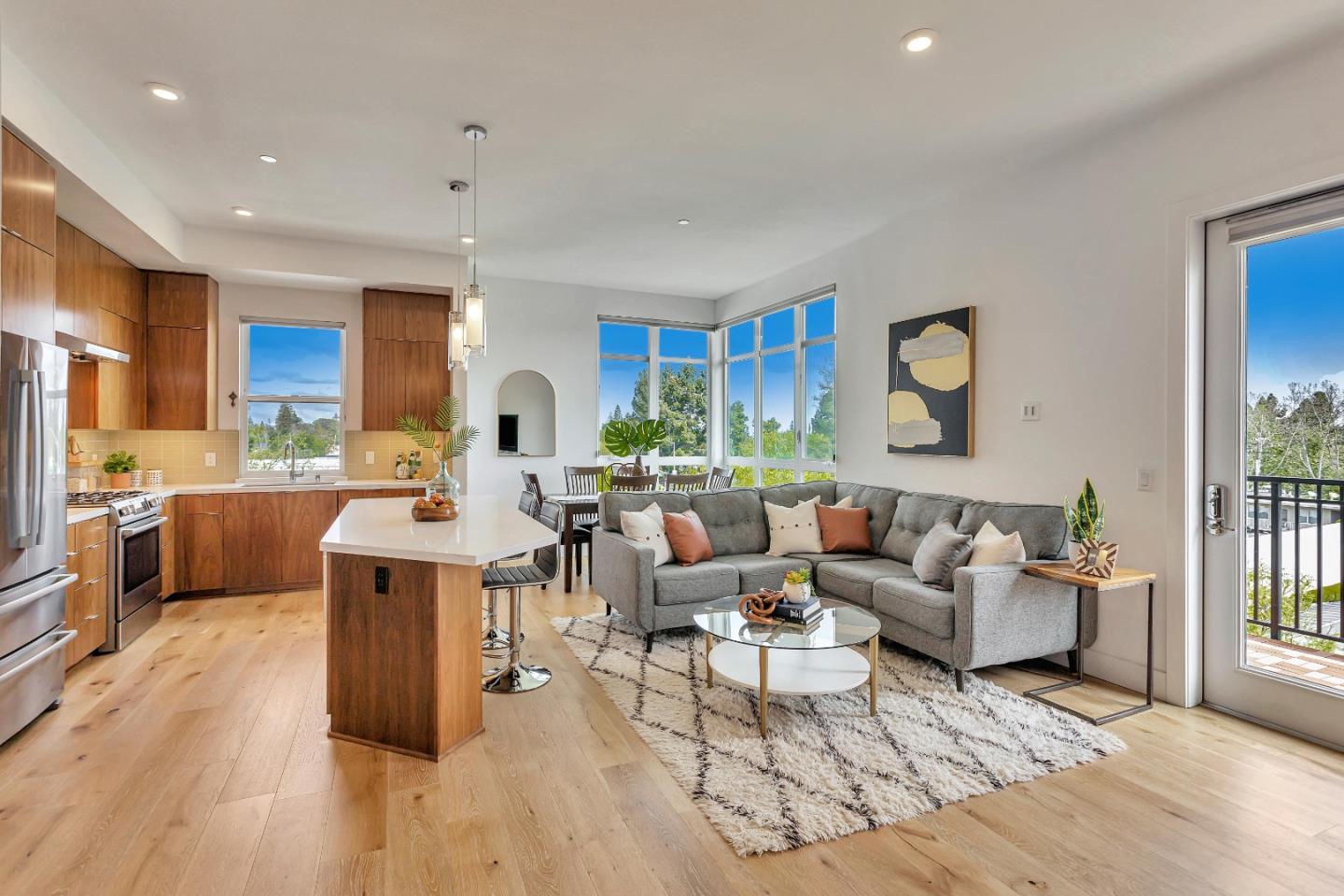 Luxury Living and Location! Top Floor, Corner Unit in downtown Mountain View built in 2017. Light and bright throughout with 10 foot ceilings. Chefs kitchen features quartz countertops, Bosch stainless steel appliances, large island, wine refrigerator, large picture windows. Elegant hardwood floors in living areas, primary bedroom suite with custom walk-in closet system, spacious bathroom with extensive vanity and lots of storage. 2 private balconies, custom window treatments and closet systems, In-unit laundry, lots of storage, and Nest thermostat. Relax in the beautiful landscaped common-area courtyard with inviting outdoor kitchen and fire-pit. Additional amenities include bike pavilion, dog run area, secured parking garage and elevator. This unit has 2-parking spots and large locked storage areas in secure parking garage. Ideal Silicon Valley Location, easy commute, walk to downtown Mountain View, great local Schools, ready for you to move-in. Easy Living in a great location!