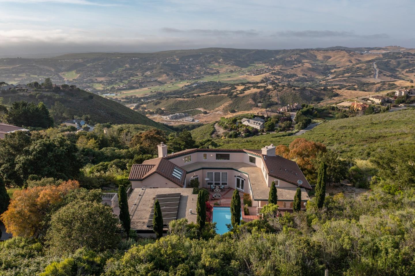 Located in the private, gated community of Halcyon Heights overlooking breathtaking and expansive views of Monterey Bay, Pasadera Golf Course, and the beautiful Santa Lucia Mountains, this stunning Mediterranean home provides a luxurious retreat just a short drive to all the wonderful amenities The Peninsula has to offer. The ~4,300 SqFt home flows effortlessly between the gourmet kitchen, indoor/outdoor living spaces, and 4 ensuite bedrooms, all centered around a dreamy pool/spa and expansive patio with the views center stage. Other highlights include a grand living room with fireplace, formal dining room, marble flooring, 3-car garage with Tesla/EV charger, air-conditioning, and ~6 acres of land. With plenty of space to host friends and family and endless activities nearby, this Monterey Paradise awaits its loving new owners to enjoy for years to come.