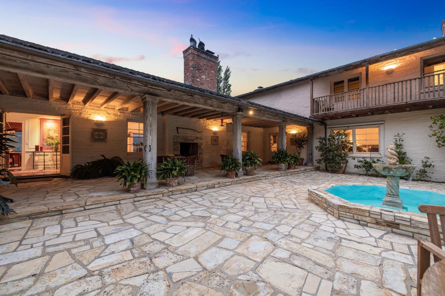 Nestled into a rolling hill, the ideal and mid-valley location is one of the most sought after for its climate and convenience. The property is one of the earlier properties in mid-Carmel Valley and the classic adobe home pays homage to the early Spanish Colonial architecture with the large central courtyard. The main level living space is 3,857 sq ft and features generous and gracious spaces that have views to the mountains and the beautiful grounds. Doors from throughout the home open to the central courtyard - making the living space even larger- and providing indoor/outdoor living. Located on 5.56 acres the home is hidden from view in the neighborhood. Inside the home is adorned with details and finishes of a Pebble Beach or Hollywood estate. Located on 5.56 acres the four bedroom, four bath,5,000 sq foot home is much like the central courtyard itself - hidden from view in the neighborhood. But from the house, the views are expansive into the Santa Lucia Mountains of Big Sur.