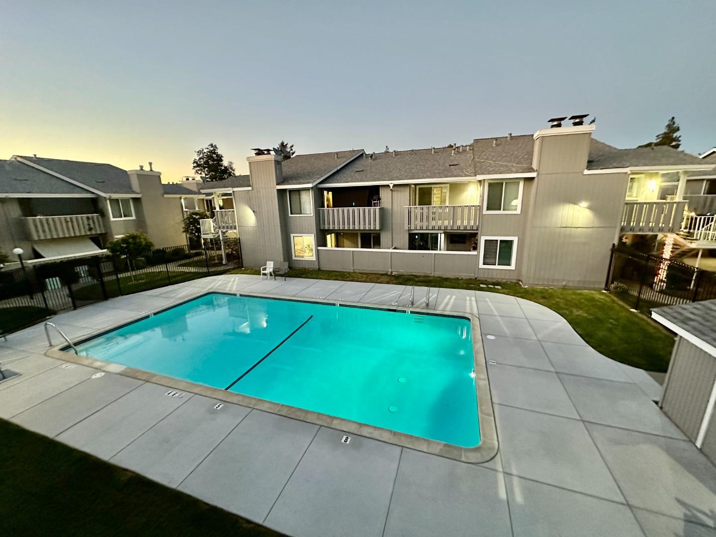 Spacious upstairs condo overlooking the pool. Move in ready! Grand living space with a fireplace and a deck. Two bedrooms plus two full bathrooms! Washer Dryer included. Large closets and extra storage. A/C newly installed. Centrally located in the heart of San Jose, features an enclosed garage. Nicely maintained complex with a garden atmosphere.