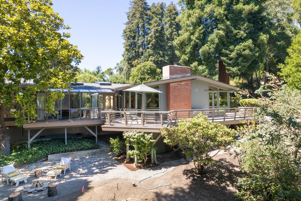 Serene home on 5.5 acres of old-growth redwoods, idyllic gardens, abundant fruit trees, meadows, oaks, and Valencia Creek frontage! First time on the market for this stunning 4 bedroom, 4 bath, quality-constructed Mid Century Modern with in-law unit, bonus den, office, interior workshop, and detached garden and shop outbuildings. Sunlit, airy indoors with spacious living room, vaulted beamed ceilings, beautiful wood floors, and soaring brick fireplace, mostly on one level. Views into the adjacent garden and redwoods near and far. Walking distance to Aptos Village shops and restaurants, easy freeway access and 6 minutes to the beach, but the home is remarkably private and secluded, surrounded by mature vegetation. Generous, solid deck next to the garden and picnic area are perfect for outdoor entertaining with excellent indoor-outdoor flow. Atrium entrance separates the main unit from the in-law, which has its own entrance, so it can be left open to the main unit or easily modified as a separate unit. Separate entry to bonus downstairs 5th bedroom/recreation room and bath as well. Take a stroll through your personal grove of majestic, 300+ ft old growth redwoods. Large usable acreage with room for ADU and possibility of lot split.