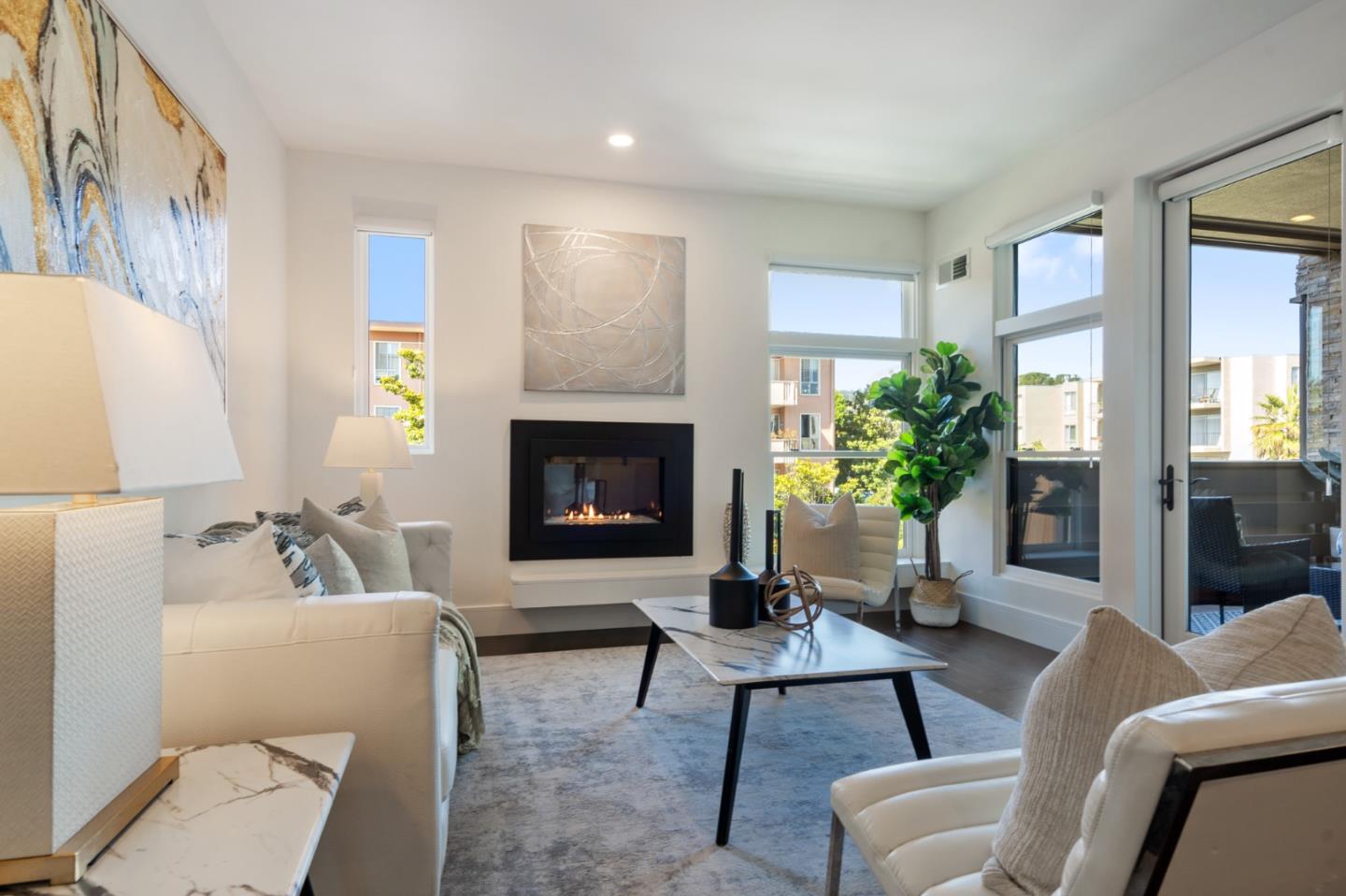 Experience luxury in this 2-bed, 2-bath condo. Open-concept with natural and recessed lights. Gas fireplace. Spacious balcony. Dining area off the spacious kitchen. Stainless appliances, gas stove with hood, glass backsplash, quartz counters, pendant lights. Sizable primary bedroom with large closet and wardrobe unit, recently installed carpet. Modern primary bathroom with tiled floors, shower over tub, double vanity. 2nd bedroom with plenty of natural light, recently installed carpet, sizable closet with organizers. Hall bathroom features large vanity mirror, roomy glass shower enclosure. Other features include: nook off kitchen perfect for WFH space, recessed lighting, engineered hardwood floors in the main living spaces. AC, double pane windows. Laundry room. Complex amenities include 2 parking spaces in the covered garage, mail room to secure packages,. HOA covers water, hot water, and garbage. Short distance to schools, Hospital, BART, CalTrans, and shopping.