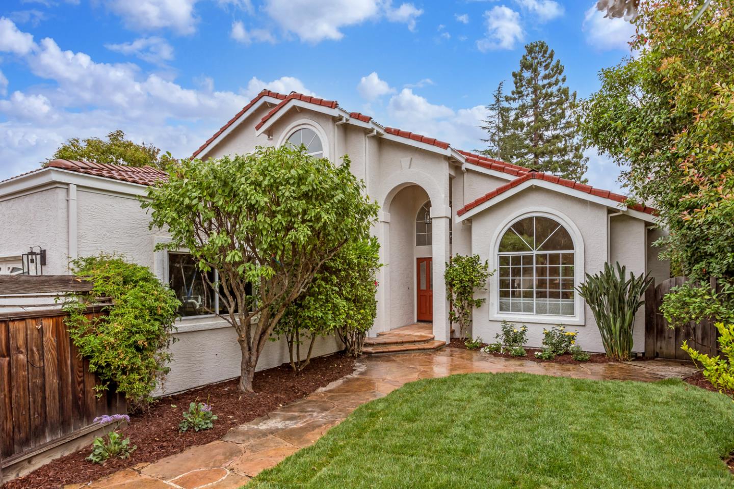 This classic and spacious home, surrounded by private yards originally designed by Mary Gordon, is located in Barron Park, minutes from Stanford and Bol Park. Enter through the fenced front yard to the dramatic and light-filled two-story foyer. Then, a living room with vaulted ceilings and a marble fireplace leads to an entertainers dining room with French doors to the yard. The eat-in kitchen overlooks striking bougainvillea, and a generous family room opens to the outdoor entertaining space. Two main-level bedrooms, could serve as offices, or in-law quarters with their separate French door entrance and full bath. Upstairs, two bedrooms enjoy arched windows, while the expansive primary suite has a walk-in closet and a marble ensuite with a jacuzzi. Outside, your private outdoor oasis includes a large flagstone patio, meandering pathways, tall hedging, mature shade and fruit trees, and a pergola. Close to top-rated schools, trails, and bike paths!