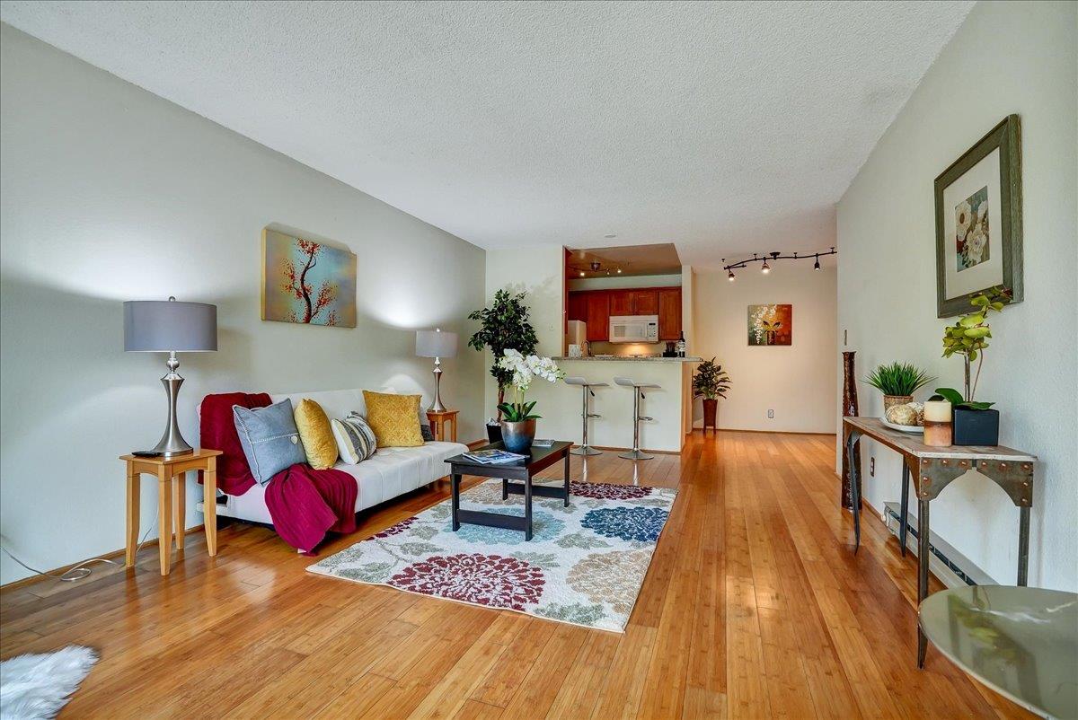 Gorgeous TOP floor unit, sunny & bright! A spacious private deck looks out to tall luscious trees. A beautifully remodeled kitchen boasts granite counters, new shaker style wood cabinets, a built-in microwave, & glass top electric stove. Cozy up to an electric fireplace or enjoy a snack break on top the breakfast counter. The tiled bath features a modern glass shower enclosure. Bamboo floors are laid throughout, a remodeled vanity has elegant granite counters, and a spacious walk- closet is perfect for the clothing enthusiast. Double pane windows & sliding glass patio door. ! car deeded parking w/ elevator. Enjoy a 3 story Clubhouse w/ separate men's & women's gym & sauna, a billiards room, & indoor/outdoor pool. 24 hr security w/ gate attendant, a dog run, tennis & basketball courts, babbling brooks, a duck pond, cozy outdoor gazebos, & more! Come see this special place. Open House: Sunday, Dec 10, 1-3pm