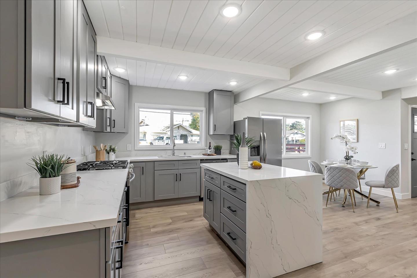 Experience modern elegance in this fully remodeled 3-bedroom, 2- bathroom in Alum Rock, San Jose. This home offers an open floor plan and designer finishes. Featuring 3 spacious bedrooms, 2 full baths, laminate floors throughout, A/C and heating, double pane windows and recessed lights. The kitchen features quartz countertops and stainless steel appliances, complemented by recessed lighting throughout. An updated bathroom awaits with a large vanity sink , quartz countertops and tile floors. Recently installed roof, stucco and fence makes this home move in ready! Take advantage of a corner lot with ample space for an ADU unit or outdoor area. Centrally located near the 680 and 101 interchange, this home offers easy access to transportation routes, making daily commutes a breeze. This is a must see!