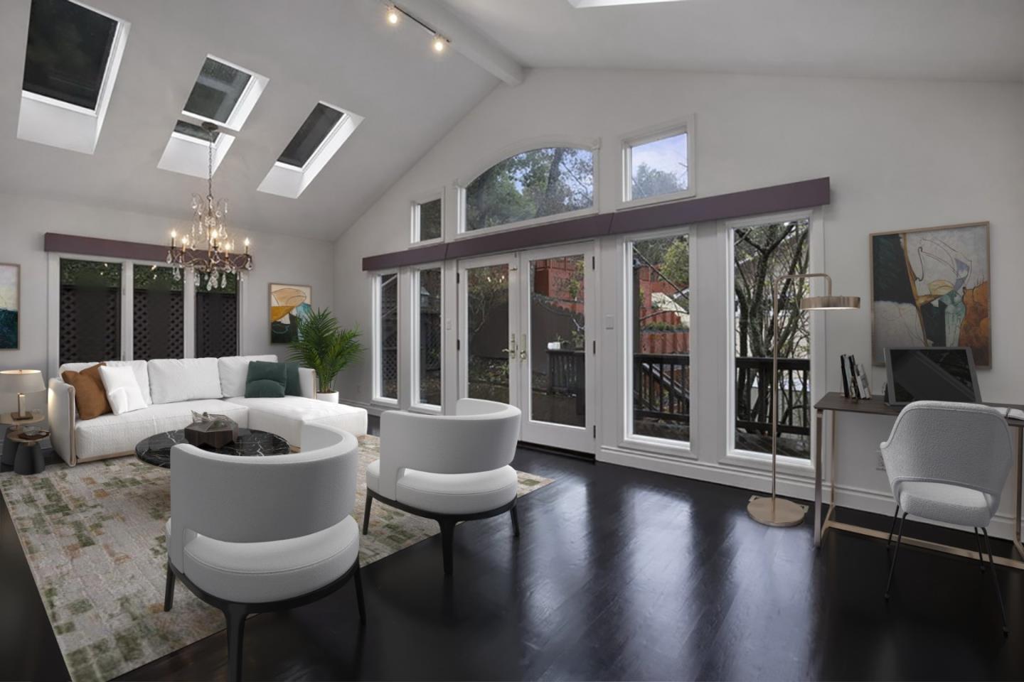 Enchanting, central location! Meticulously renovated, multi-level home with expansive windows framing a lush outdoor sanctuary. Sprawling 15,560 sq. ft. lot features mature foliage, triple terraces, play area, entertainment deck, and a charming cottage. Features brand-new appliances, 1-year-old washer/dryer, refinished flooring, and new carpets. A/C and heating for added comfort. Rent includes gardener; pets ok.