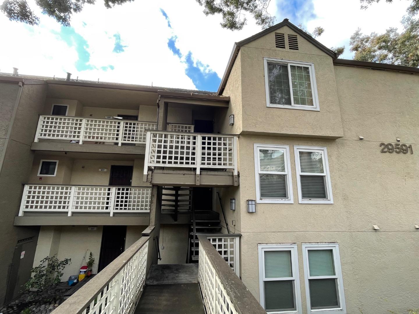 Gorgeous top floor 1 bedroom condo with breathtaking city view! Built in 1988 with 643sqft. New paint & move in ready. Master bedroom with walk in closet. Modern new vanity lighting fixture. Engineering wood flooring throughout the unit. Kitchen with granite countertop. Brand new stainless steel appliances including new cooking range, microwave & dish washer. Stainless steel refrigerator & newer stack washer & dryer are all included with the sale. Covered patio with deck for relaxing. Amenities include pools, spa, gym, sauna, and a clubhouse. Monthly HOA $464.41 covers water, sewer, garbage, and exterior maintenance. Designated reserved carport parking space (# 908) & plenty of street parking. Short distance Bart, Cal State Eastbay & downtown Hayward with lots of restaurants and stores. Easy access to highway 880 & 92.