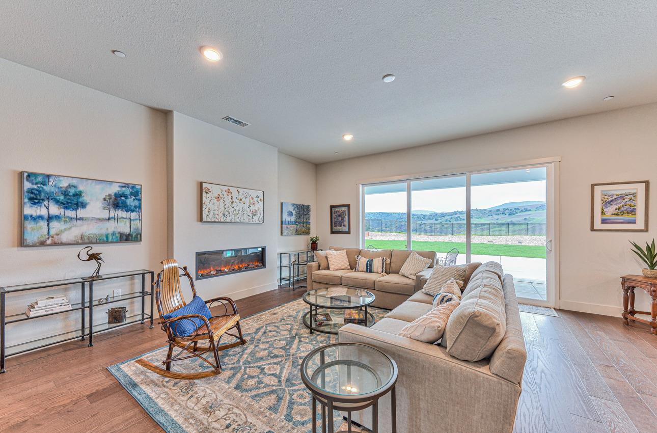 Enjoy the INCREDIBLE VIEW of the rolling hillsides and valley floor from the comfort of this stunning, open concept one-story farmhouse-style home, in the Ridgemark Community. The home comes with 4 bedrooms, 2.5 baths, a versatile flex room that can serve as a study or office, and an extra-large primary suite closet. A huge great room opens out to a covered patio through 12 8 multi-slide patio doors. Upgrades galore! The kitchen features quartz countertops, a large island, gas range, stainless appliances, self-closing cabinets and pull-out shelves. This property includes an owned solar system, an owned salt-free water filtering/conditioning system and upgraded electrical wiring ready for lights, ceiling fans and TV in the great room above the electric fireplace. There is plenty of room for all your outdoor activities with a large concrete patio area and walkways on an extra-large 16,500 sq/ft lot with natural gas line to back patio for your BBQ, large planter areas and front and backyard completed landscaping with irrigation system. There are 3 finished garage spaces and a tankless gas water heater.