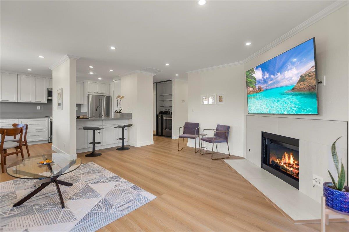 Stunning Hayward Highland Modern Remodeled Condo w/Views of the Mountains & Oakland City Lights. Serenely located at the rear of the complex, this unique home has a tranquil setting backing the lush green hills. Finished w/the finest quality, no detail has been spared in this popular open concept floorplan. The Gourmet Chef's kitchen showcasing an expansive island including bar seating open to the living room, dining room & private balcony. The kitchen features sleek white cabinets, French Light Gray Quartz counters, ample prep space, abundant storage, soft close drawers, & deep pot drawers. New & newer Appliances: Samsung Range, Microwave, washer & dryer along with an LG dishwasher. Gather around the new Samsung big screen TV & cozy fireplace in the living room. Corner location w/extra windows with soaring sunshine. The updated baths have designer cabinets, light fixtures & faucets along w/new glass doors. The oversized primary suite has room for an office along w/a walk in closet with a trendy barn door. Floor-to-ceiling mirrored closet doors, new luxury wide plank vinyl flooring, recessed lights, crown molding, new baseboards, HOA pool & rare private enclosed 2 car garage located just below at garage # 80 & 81. Added bonus: elevator access across the hall from this home.
