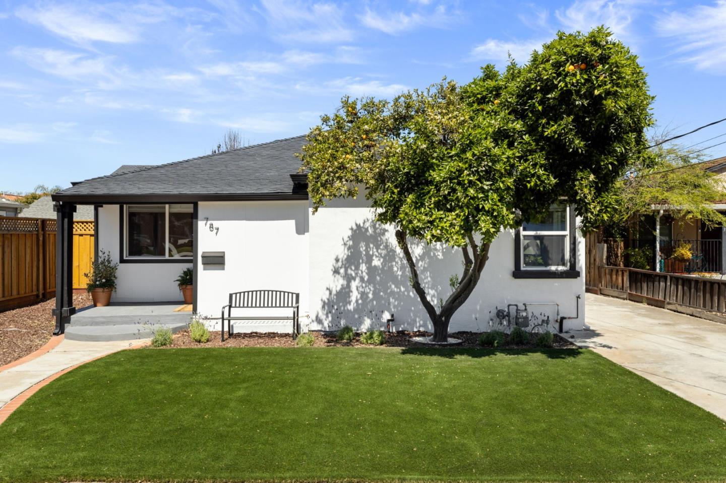 Experience the epitome of luxury in this meticulously crafted Willow Glen bungalow. Welcoming all with an inviting front porch, this modern retreat exudes warmth and hospitality. Sophistication abounds in every corner, from the contemporary interior design featuring LVP flooring, modern accents, and sleek black hardware. The chef's stadium kitchen is a culinary delight, boasting white/gray quartz countertops, stylish cabinetry, and top-of-the-line stainless steel appliances. Relax in the expansive living room complemented by a tiled contemporary fireplace. The luxurious primary suite offers tranquility with two closets and an updated ensuite bathroom featuring a seamless glass shower and exquisite marble finish tile. Two additional bedrooms provide versatility, while the vaulted great room leads to the serene outdoor oasis that invites relaxation with manicured landscaping, a hardscape patio, and raised garden beds. Nestled in the desirable Willow Glen neighborhood of San Jose, enjoy close proximity to historic Lincoln Street, renowned dining, serene parks, downtown San Jose, and all of your tech offices.