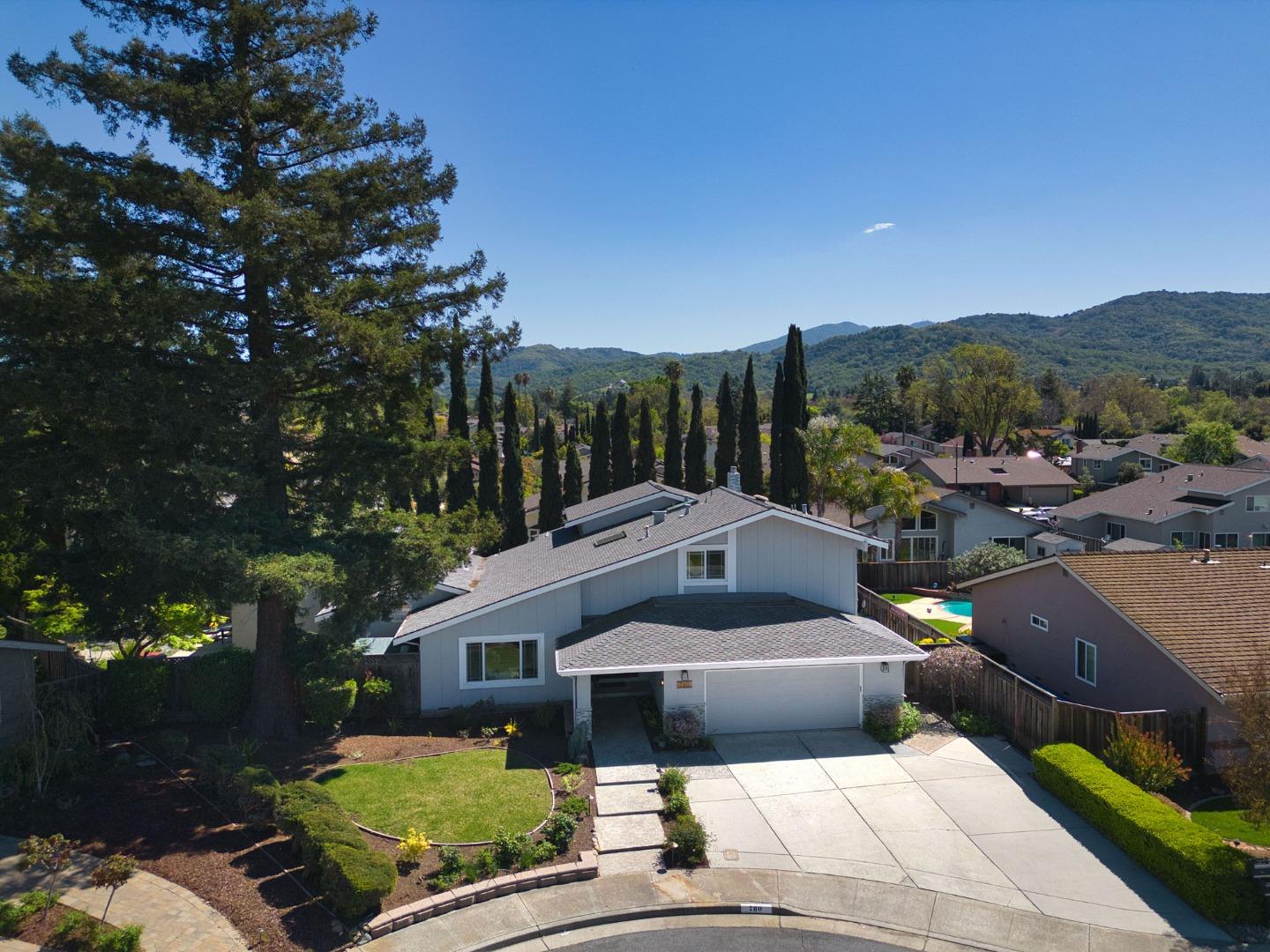Woodside of Almaden neighborhood near the Calero Creek and Los Alamitos Trails. Four bedrooms plus an office on main level. One of the bedrooms is downstairs with adjacent full bath. This home showcases soaring ceilings, wood floors, and recessed lighting throughout the home. The kitchen features granite slab counters recessed lighting and soft-close wood cabinets. Stainless appliances GE Monogram five-burner gas cooktop. The adjacent casual dining area has a built-in buffet with soft-close cabinetry, upper glass-faced cabinets, a granite slab counter, and a pantry behind a frosted glass door. Natural light pours through a pair of skylights in the family room. The primary has wood flooring, a vaulted ceiling, and recessed lights. Its en suite features a dual-sink vanity with a mosaic tile backsplash, recessed and pendant lighting, and a walk-in closet behind a door with an inset mirror. A shower over a Jacuzzi tub features a tile surround with mosaic tile accents. The backyard offers a private outdoor sanctuary with lush foliage, seasonal bloom &, multiple vignettes. Outdoor kitchen. Koi pond. A charming wooden red bridge invites you to cross over and explore a whimsical storybook playhouse
