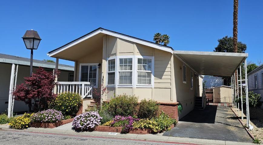 Welcome to Monterey Oaks #302 a place that you will be sure to call home. Come take a look at this 2000 Silvercrest 3 bed 2 bath beauty. Located by the clubhouse & pool, enjoy approximately 1,214 sq-ft of living space nestled in the 5-star community of Monterey Oaks. This home features laminate floors in the living room, kitchen, dining room & hallway. Large open kitchen with snack bar, bay window & stainless-steel appliances. Open concept floor plan with high soaring vaulted ceilings & clearstory windows. Enjoy a large master bedroom with large walk-in closet. Spacious master bathroom with linen cabinet double sinks, soaking tub & shower. From ceiling fans, AC, shed, outdoor space to BBQ & gardening, all make this home very desirable & move-in ready.