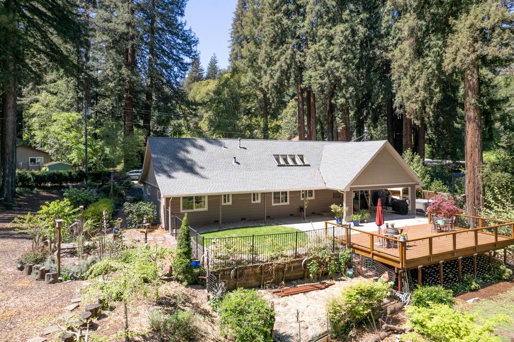 Room to Roam-Wonderful single level home in a private close in Felton location on 1.73 acres-very useable! Spacious open floor plan in living/kitchen & dining rooms have up to 25 ft ceilings. Custom fans, lighting. Gas fireplace, separate level for dining. Newer cabinets/granite in kitchen w/ stainless appliances-large island. Laminate in living room & hardwood throughout. Hall bath just remodeled-new cabinet-counter-faucets & tile surround. Step out onto covered patio w/ recessed lighting, wired for sound & spa to left of gate will stay. Outdoor Shower. Nice extended view deck over grounds & lawn area are fenced. Wonderfully landscaped with several areas to enjoy entertaining. Cute little egg house out front for free eggs to the neighbors. Large portion of lot is level(Horses?) Separate Goat house & chicken coop. Goat house could be a play house for kids. Gate beyond driveway can house RV, boat, tractors, etc. 2 car garage w/ 1/2 ba, and laundry hookups-loads of stand up space attic above garage for more storage or ?? Leveled and rolled DG parking area-canvas covered carport for extra car. Off street parking for several more. Shed down below carport for extra storage. Easy walk into the friendly town of Felton and close to Henry Cowell entrance for hiking & enjoying nature.