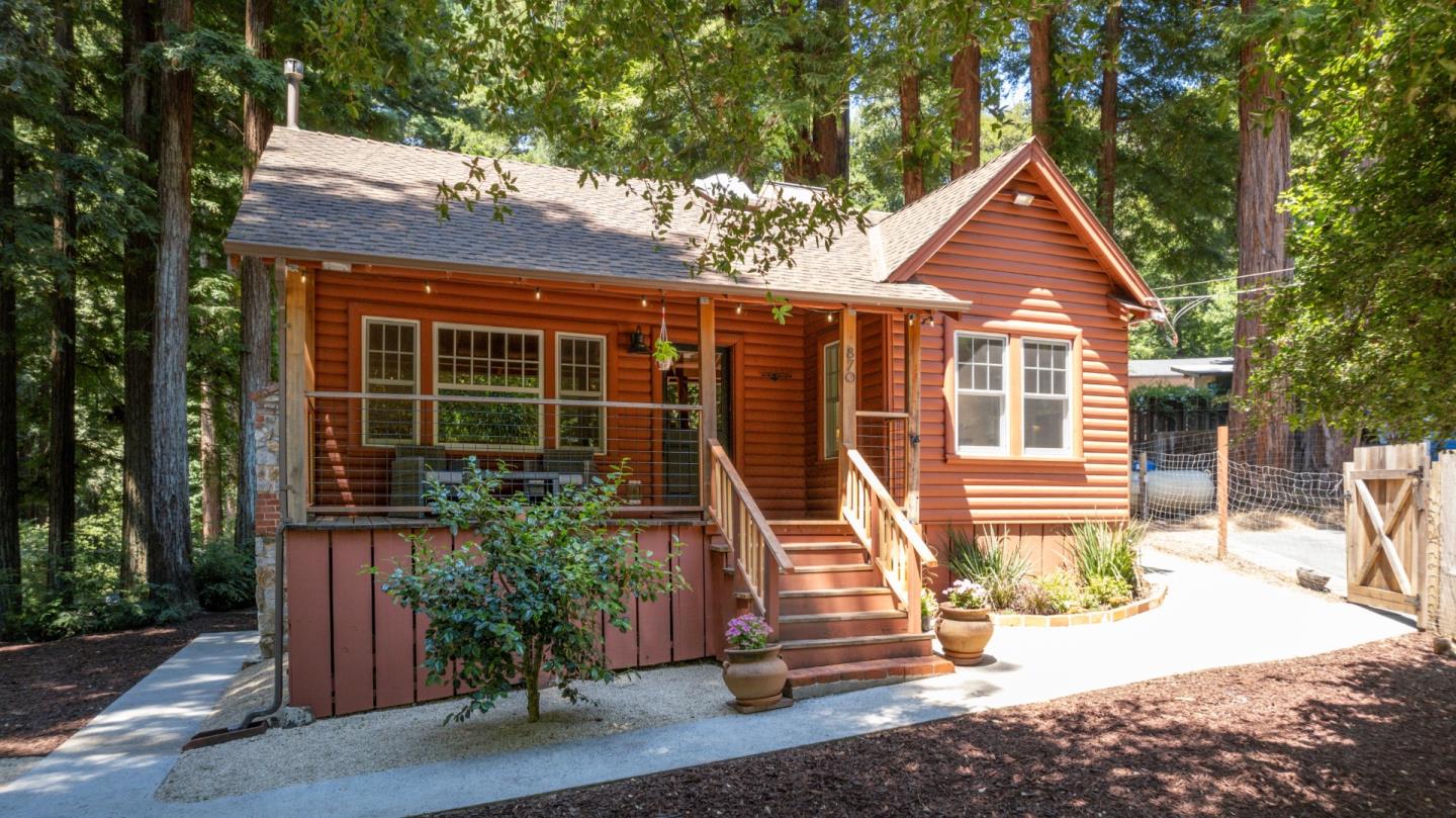 Escape to the cutest red cabin with a sweet blend of charm & modern amenities! Step inside to discover a newly renovated kitchen & bathroom, seamlessly integrating contemporary convenience with the cabin's original character, all while maximizing storage space with thoughtful detail. The kitchen boasts quartz countertops, wifi enabled stainless steel appliances, & modern LED fixtures. The spacious living room, adorned with tall ceilings & a cozy fireplace, creates an inviting atmosphere perfect for relaxing or entertaining. Upstairs, a versatile loft with skylights awaits, ideal for a home office, guest area, or creative nook. Natural light floods this home, enhancing the open and airy feel throughout. Outside, enjoy coffee on the picturesque front porch or custom built entertaining / fire pit circle. A large fenced yard provides ample room for pets to roam or for garden enthusiasts to cultivate their own mountain oasis. Oversized paved driveway offers parking for 6+ vehicles. County maintained road. Surrounded by majestic redwoods, you'll feel worlds away from the hustle & bustle, yet remain within easy reach of Silicon Valley & the stunning Santa Cruz beaches. Don't miss this opportunity to own a peaceful retreat with all the comforts of home.