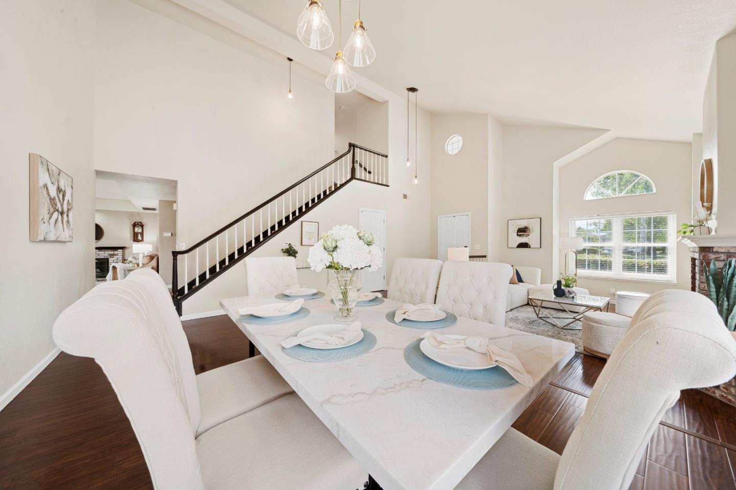 WOW! Unveil your dream home in Morgan Hill* Nestled in the private Portola Ranch community, this exquisite corner lot gem boasts stunning curb appeal w/ lush lawns, stone accents, crowned by a tile roof. Inside, soaring vaulted ceilings create a dramatic ambiance, while sun-drenched interiors flood every corner w/ warmth and positivity. Open floor plan w/ 5BR | 3BA, including desirable 1BR & 1 full BA downstairs. Living room exudes modern elegance w/ hardwood floors and a fireplace, seamlessly connecting to the formal dining area. Dual zone AC/ Heat. Beautifully remodeled kitchen features granite countertop, sleek cabinets, stainless steel appliances, while the family room offers cozy retreats. Step outside to a backyard oasis w/ fruit trees and impeccable landscaping. Upstairs, a spacious master suite awaits w/ a walk-in closet, soaking tub, and double sinks, providing a serene sanctuary. 3 additional well-sized BRs and a shared BA offer ample space. Low HOA dues $190 cover front lawn maintenance and a sparkling community pool. Conveniently located near downtown amenities and esteemed schools. Easy access to freeway, beautiful parks, bike paths, Morgan Hill is a favorite among homeowners, including many professional 49ers players. A perfect blend of lifestyle and comfort!