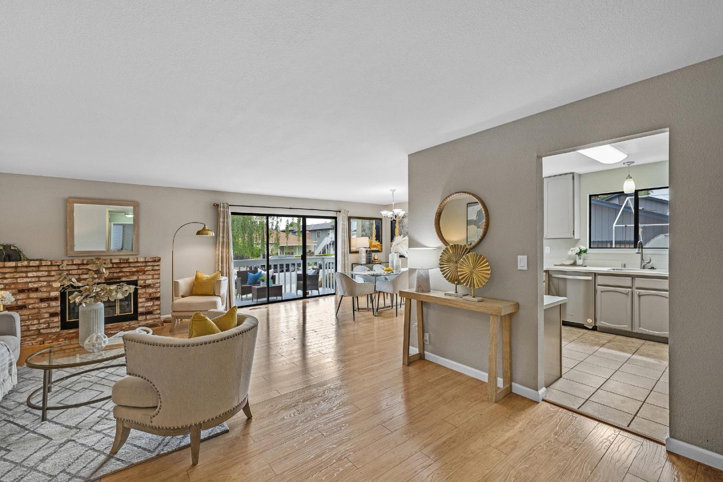 Bright Chic Home West of El Camino Real! Enter inside this lovely, sunlit, corner unit and feel right at home with its warm and inviting atmosphere. The open layout is perfect for relaxing or entertaining, featuring a handsome brick-faced wood-burning fireplace. The kitchen is a delight, updated with sleek Quartz countertops, and a convenient breakfast counter. It's well-equipped with stainless steel Whirlpool appliances and offers abundant cabinet space, both above and below. Right next to the kitchen, the spacious dining and living rooms welcomes natural light through large glass doors that open onto a deck - ideal for savoring your morning coffee or unwinding with a glass of wine under the stars. This home includes two large bedrooms, each with ample closet space. For added convenience, this home comes with a stacked washer and dryer. Parking is easy with one covered carport and one open parking space. Located just moments from the bustling heart of Redwood City, you are perfectly positioned to enjoy quick access to local eateries, chic cafes, and vibrant shopping centers. 84, 101, and 280 are nearby making your commute to work or weekend excursions around picturesque San Francisco Bay Area a breeze. Don't miss out on this rare and incredible home - you'll love living here!