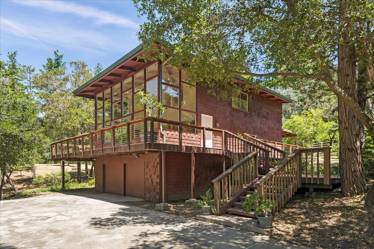 Nestled centrally on Loma Prieta Ave, this modern architectural gem seamlessly integrates indoor and outdoor living. Designed with meticulous attention to detail, the home boasts a wrap-around deck, inviting you to relax. Set on 2 acres of mostly level, usable land, complete with a seasonal pond, this property provides endless opportunities. The great room serves as the heart of the home, featuring a wrap-around wall of windows that frame the serene setting, flooding the space with natural light. The spacious kitchen is a chef's delight, featuring an island with a sink, abundant counter space, and cabinet storage, making it ideal for entertaining guests. The primary suite, conveniently located on the main level, offers a private sanctuary of comfort and relaxation. Upstairs, two spacious bedrooms with open beam ceilings provide additional comfort and charm, while a spacious full bathroom completes the second floor, offering convenience and functionality for the upper level. Conveniently located, this home offers easy access to coastal beach towns, the Summit Store, and local wineries. Comcast Internet provides connectivity and convenience. Served by top-rated schools, Loma Prieta Elementary, C.T. English Middle School, and Los Gatos High