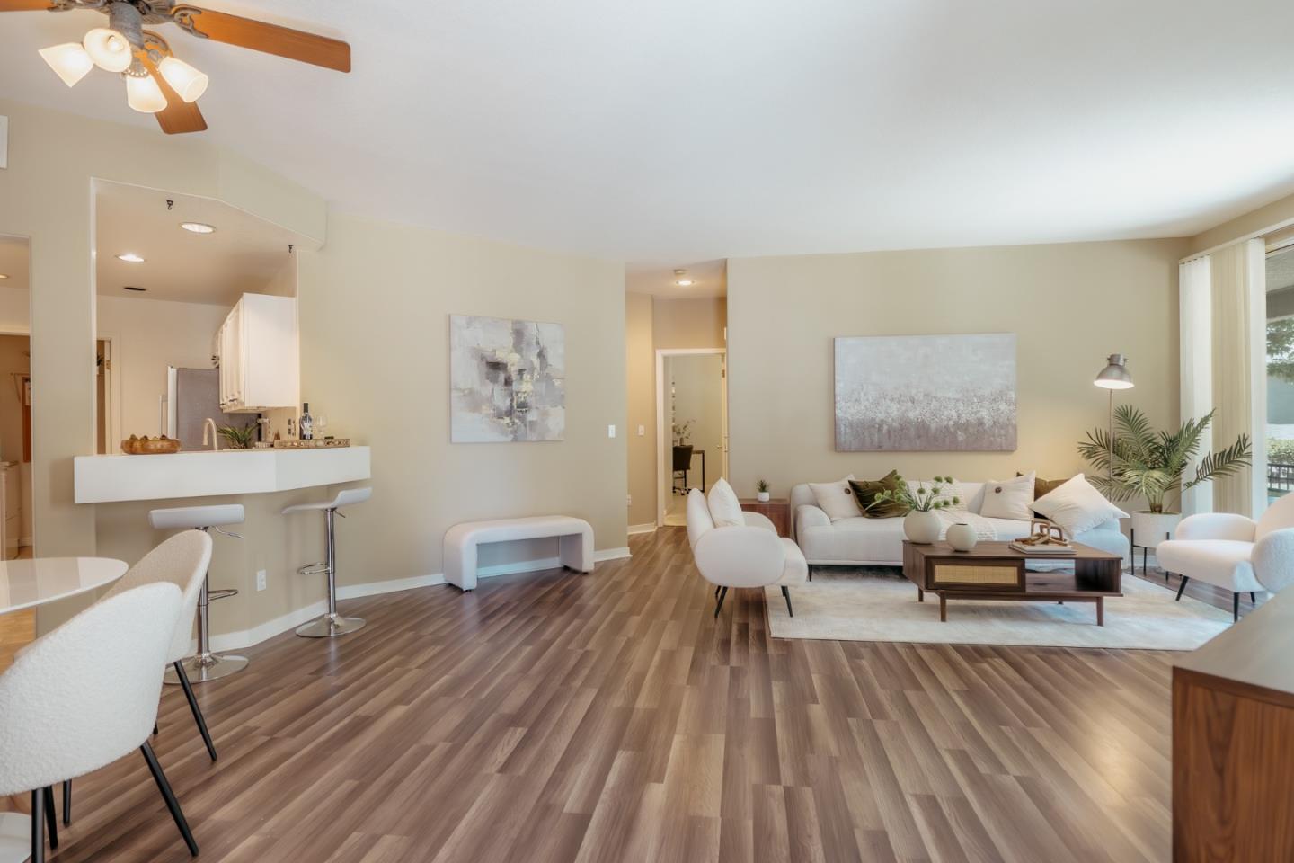Centrally located near all the amenities Downtown San Jose and Japantown are well known for, this incredibly spacious and well maintained 2 bedroom and 2 bath condo features the exceptional flow of an open floor plan awash in natural light. With high ceilings, freshly painted walls and high end laminate flooring, and brand new stainless appliances, this home has the executive feel to match the stylish location of the Vendome neighborhood. Updated bathrooms, including a huge master with walk-in closet, and a spacious private patio make this unit feel almost like a single family home, complimented further by the full laundry room and attached 1-car garage. In addition to the beautiful interior this home also sits within the San Pedro Square community with a glimmering swimming pool and mature, well maintained grounds! The central location is near Japantown known for Sushi and trendy shopping/dining options, as well as near downtown SJ where many tech companies, and other amazing employment opportunities abound (legal, tech, government). Other neighborhood amenities include Whole Foods, Trader Joe's, the SJC airport, a full spectrum of dining and entertainment options, the San Jose Sharks, San Pedro Square with a weekly farmer's market and so much more!