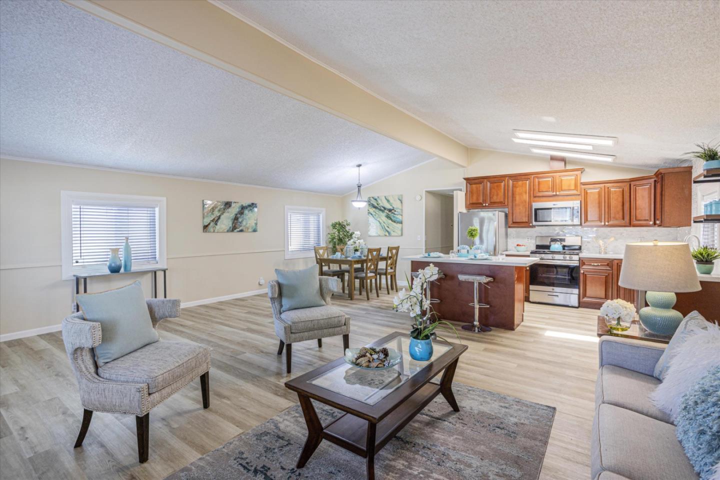 Step into this wonderfully updated home in the sought-after Casa Del Lago park. Inside, enjoy the fresh ambiance of new luxury vinyl tile floors throughout. Vaulted ceilings and large windows illuminate the living room, while the adjacent dining area offers a charming space for meals. The kitchen, complete with an island and skylight, inspires culinary creativity, while a convenient laundry room simplifies chores. Retreat to the primary bedroom, featuring a large mirrored closet, a contemporary bathroom with upgraded finishes, and a private door to an outdoor retreat. The second and third spacious bedrooms provide versatility for family, guests, or home office spaces. Stay comfortable year-round with central forced air heating and air conditioning. Outside, a large deck and patio area offer seamless outdoor living, and the large storage shed in back is perfect for toys and equipment. This community provides access to amenities like a clubhouse, pools, spa, gym, and more. With competitive space rent, and easy access to shopping, groceries, and the freeway, this home is a true gem.