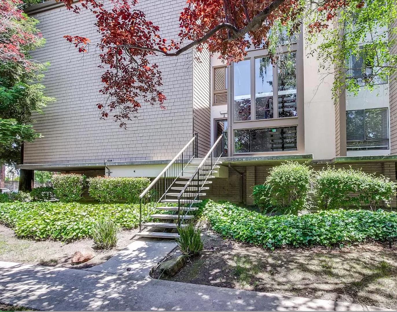 End unit at the Old Mill complex - with no direct neighbor on either side. Large living/dining room combo between bedrooms for added privacy. Gas log fireplace in living room; balcony with extra storage; all appliances included; 1 designated underground parking space close to elevator; lots of additional parking; sewer, trash and garbage included; 2 pools, spa, sauna. Los Altos Schools; close to Caltrain station; close to shops;