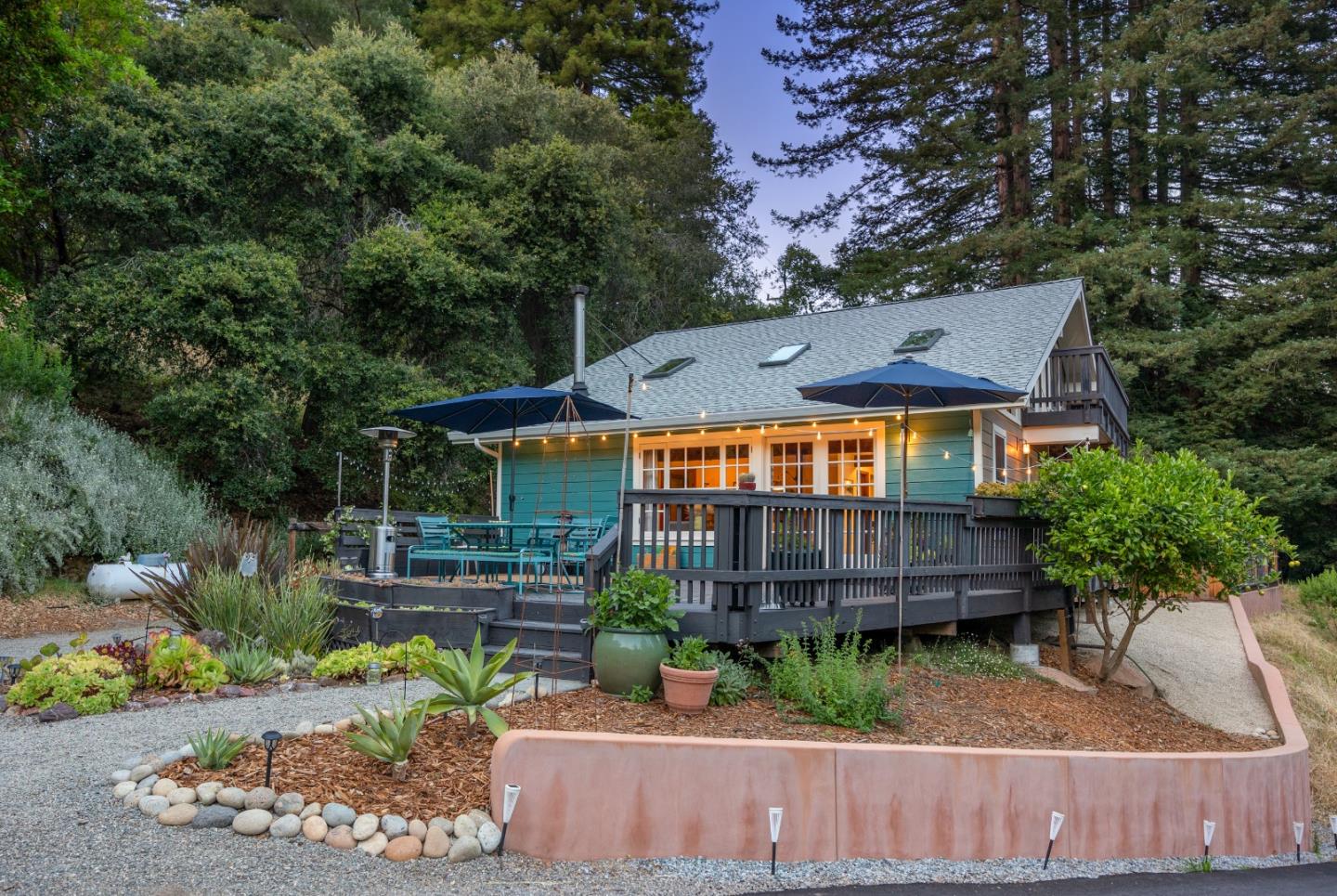A relaxed rural retreat with a strong country vibe on 3 sunny acres w/forested views and the soothing sounds of silence. This 3br, 2ba, 1749 sq ft home has a soulful mountain appeal lovingly updated over the years w/contemporary amenities & upgrades like: stainless appliances, quartz counters, subway tile, modern lighting, new roof & skylights. Open/kitchen great room w/wood windows designed to drink in the views and fill the house with light. A vaulted ceiling gives added depth to the intimate sitting areas. Also an informal breakfast bar and a dining area large enough to host parties. Primary suite w/updated bath, walk-in closet & private deck plus guest rooms w/flex options for art, office, or meditation spaces. High ceilings and french doors open directly to the park-like surroundings and a large fenced yard for pets and playtime. An expansive, sun-drenched main deck epitomizes indoor/outdoor living w/al fresco dining, barbeques, firepit, spa/hot tub and a standing invitation fo well-earned r & r. Private but not isolated, this home is situated halfway between Santa Cruz and Scotts Valley, close to town and the beach and in the perfect commute location. Digital workers can also transform their zoom calls into peaceful moments of communion with nature.
