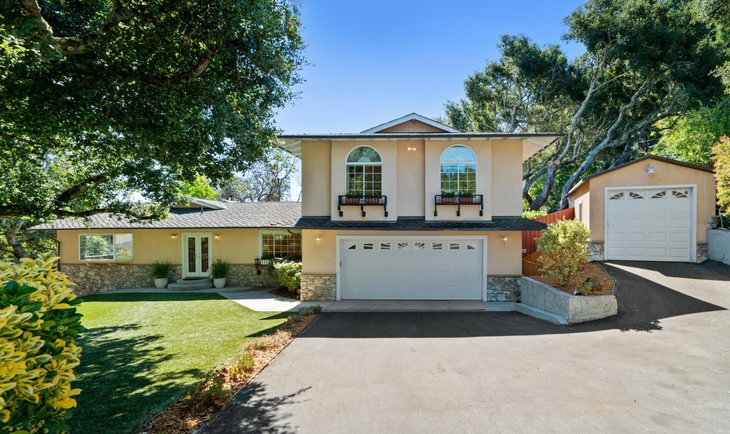 Tuscan-inspired estate on 1/3 of an acre w/ awe-inspiring views & exceptional privacy. Boasting 4 bedrooms (primary suite is on the ground floor) +office, 3 full bathrooms & ~3,000 sf of living space. Enormous living room/dining room combo featuring picture windows that bring the outdoors in & bathe the home in natural light. Stunning Chef's Kitchen w/ wood cabinets, granite countertops, high-end SS appliances, breakfast nook & breakfast bar. Separate sitting room off the kitchen w/ cozy gas insert & sliding glass doors to the back yard. An absolute showstopper, the back yard has a sparkling inground pool, weather-proof cabana & whimsical pathways through the heritage oak trees & lush gardens. Primary bedroom has vaulted ceilings, mountain & pool views, walk-in closet & updated bath w/ walk-in shower & luxurious soaking tub. Upstairs features 3 additional bedrooms, full bath & huge bonus/rumpus room. Solar (owned), 2 cooling & heating zones, whole house sound system, attached 2 car garage w/ built-ins & temperature controlled wine storage & detached 3rd car garage w/ car lift! Fantastic location walking distance to Skypark, Henry Cowell SP, Laughing Monk Brewery, shopping & more. Award-winning Scotts Valley schools! What more could you ask for? Welcome home, you belong here!