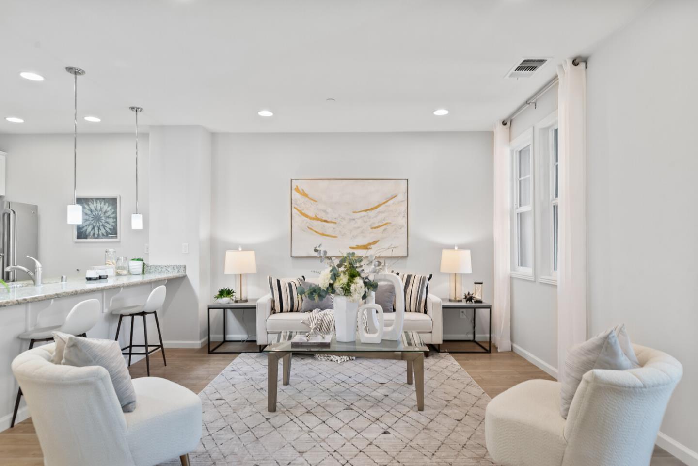 Experience the bright and airy charm of this impeccably maintained home, featuring an open floor plan and over $41k in exquisite upgrades. The top-floor living area boasts high ceilings, recessed lighting throughout, and expansive windows adorned with elegant casings and sleek plantation shutters. The stunning kitchen stands out with its granite countertops, shaker cabinets, modern appliances, aesthetic pendant lights over a large peninsula, and a lighted pantry. Stylish wood flooring graces the formal entryway and living spaces, while plush carpet with extra padding enhances the comfort of the stairs and two spacious bedrooms. The second bedroom is further refined by sophisticated crown molding. Enjoy efficient cooling with the home's whole-house fan in addition to its AC, and make use of the finished side-by-side 2-car garage, complete with ample storage organizers. The community features picturesque tree-lined sidewalks and two brand-new city parks. Conveniently located near Challenger School, Municipal Golf Course, Townsend Park, Safeway, Costco, H Mart, Ranch 99, and a variety of restaurants, with easy access to major tech companies. This 10-year-old home emanates a feeling of newness with its top-quality upgrades, promising a delightful living experience. YOU'LL LOVE IT!