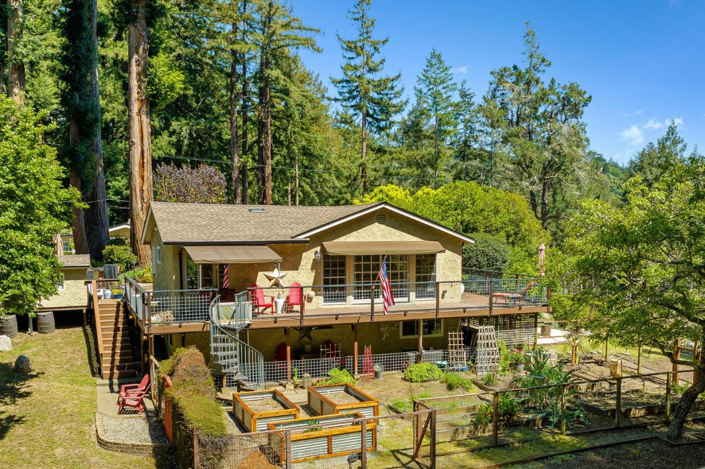 Two Separate Homes on just over an Acre! This magical homestead property located on a private paved road has been lovingly maintained and is set up perfectly! Beginning with a single level main house with 3 bedrooms, 2 are primary suites, stunning kitchen with cherry cabinets, granite countertops, stainless steel appliances and breakfast bar. The second home features granite kitchen countertops and alder cabinets. There is also a separate studio unit with a full bath attached to the 2-car garage. Lastly a separate carport with attached space that is currently setup as a gym. There is no shortage of parking on this property. It is perfect for entertaining large groups with an exquisite outdoor centerpiece under the beautiful redwoods. Once the sun goes down you can head over to the amazing bar. Relax and unwind. Bonus items include separate storage sheds, whole property Generator, owned solar panels, LED lighting throughout, a fenced garden with raised beds, an abundance of fruit trees, fully fenced property with a gated entrance. Centrally located with access to Soquel, Capitola, Santa Cruz, Scotts Valley and HWY 17! Come and enjoy this captivating and tranquil property filled with a peaceful ambience.