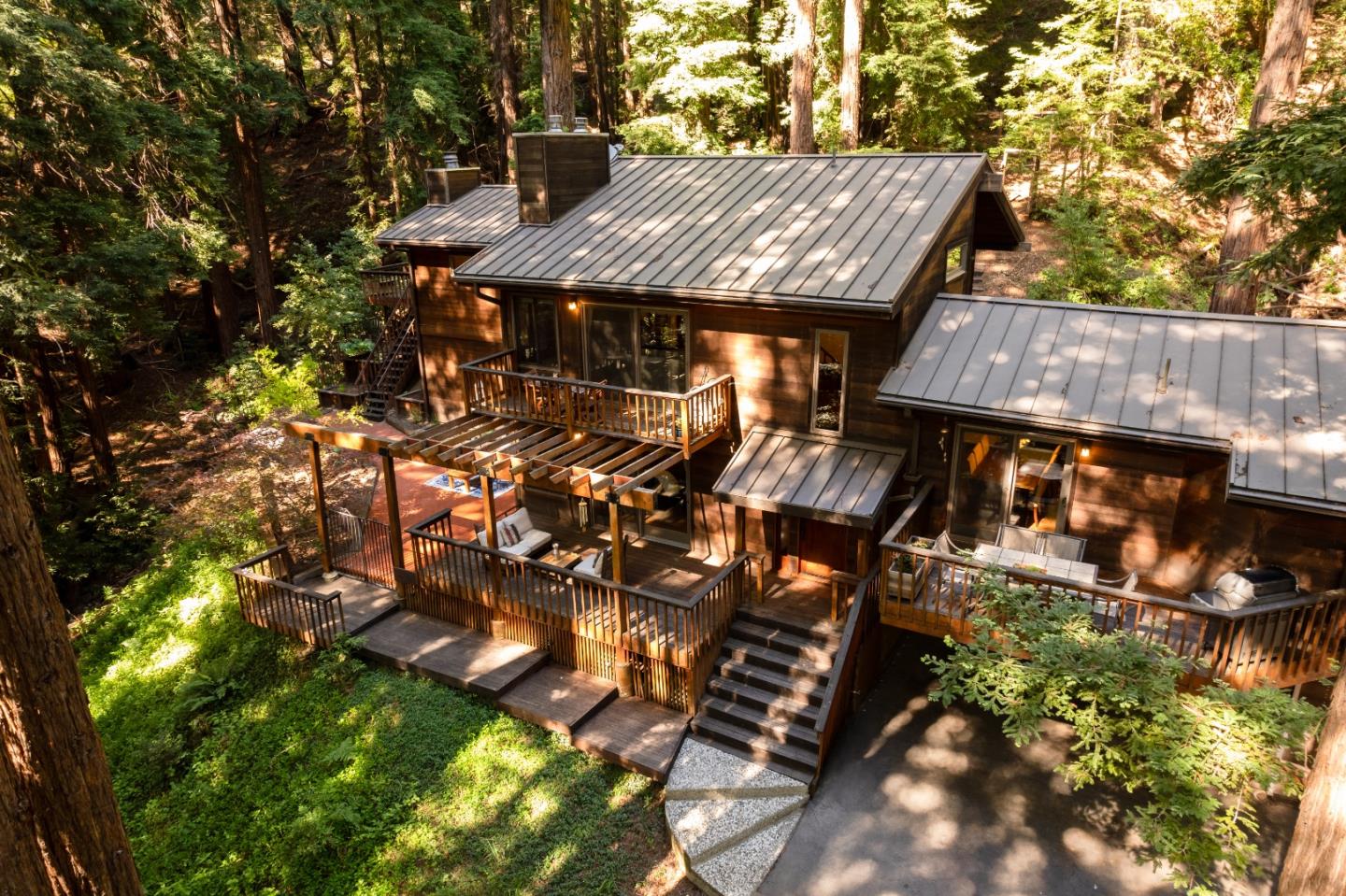 Your Lake Tahoe luxury resort is RIGHT HERE in the Los Gatos Mountains! Only 5 minutes from Hwy 17 at Summit, minutes to Los Gatos and Silicon Valley and minutes to the beach! Beautiful Craftsman home with some of the most stunning workmanship and attention to detail from the custom builder that you will ever see. Situated in an idyllic private forest setting, this Craftsman style beauty really shines with natural elements of stone and wood accentuated in Sky-high wood beamed ceilings and beautiful stone fireplaces in the Living room, Family Room, and Primary Bedroom. Primary Suite is beautiful with fireplace, full En Suite with separate shower and tub, and private deck with hot tub. Both guest bedrooms are spacious, also with their own private deck. Outside you will love the extensive flagstone patio area w/ fire pit, in addition to the many decks and other patio areas. The kitchen is stunning in its layout from the spacious dining area to the incredible amount of counter-space everywhere. This will be one of the main gathering spots for family and friends! Plenty of beautiful decking let you experience the beautiful surroundings with plenty of seating and entertainment spots everywhere you turn. The separate lower lot is perfect for RV and boat parking or maybe future ADU.