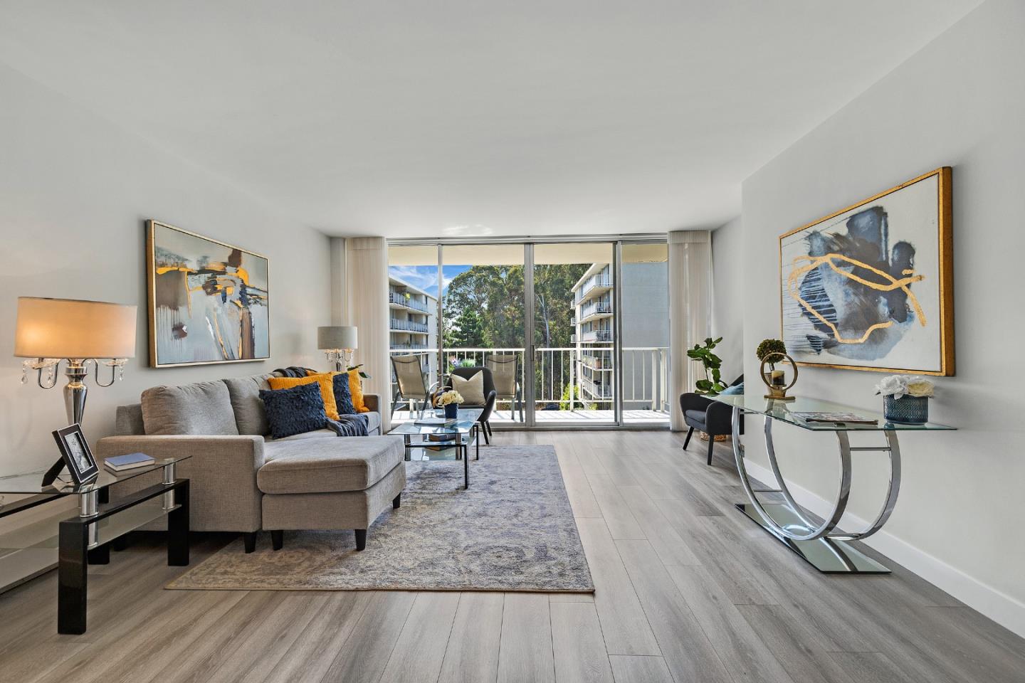Fully renovated and meticulously maintained, this 1BR/1BA mid-century modern condo in pristine condition boasts a new kitchen with quartz countertops, stainless steel appliances, and shaker cabinets, an updated contemporary bathroom, new closets with built-in storage, and new light laminate floors throughout. Elegant new Hunter Douglas custom window treatments adorn the expansive floor-to-ceiling windows. Simplicity and sophistication converge in this charming home nestled in the rolling hills of Belmont. Graceful natural light streams through expansive floor-to-ceiling windows, emphasizing the distinctive clean lines, light plank flooring, and contemporary aesthetic throughout. Thoughtfully designed for optimal functionality, the open living spaces seamlessly connect and effortlessly flow to the exclusive deck with green views, inviting occupants to experience an indoor/outdoor lifestyle. Situated on the 6th floor of a secure building, this unit includes one deeded underground parking spot and an additional storage facility. Enjoy remarkable amenities such as a sky room and rooftop deck with captivating bay views, two swimming pools, two spas, a gym, and a billiards room. Just steps away from Davey Glen Park and minutes to Caltrain and major commuter routes!