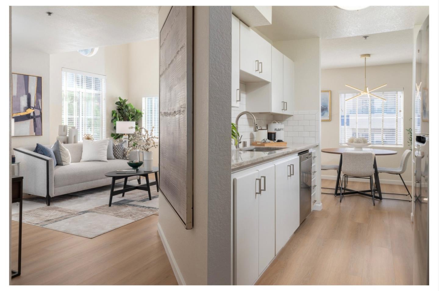 Experience unparalleled living in this top-floor corner condo unit at the Bayside Commons. With its extra windows and vaulted ceilings, this residence offers an open, airy atmosphere and stunning panoramic views of the city skyline, Marina Bay, hillside, and the serene courtyard at the privacy of the balcony. This tastefully renovated unit is soaked in natural light, showcasing a stylish and modern interior. The updated kitchen features LG appliances, including an electric range, refrigerator, microwave, and dishwasher. Newly installed hardwood floors and a cozy fireplace add to the homes inviting ambiance. Bayside Commons offers a wealth of amenities designed for recreation and relaxation: EV charging stations, optional storage rentals, bike storage, clubhouse, fitness center, tennis and basketball courts, jacuzzi, sauna, heated swimming pool, BBQ area, and playground. The gated community also provides ample parking for residents and guests. Located in the distinguished Albany School District and just minutes from UC Berkeley, this home offers convenient access to hiking trails, BART, El Cerrito Plaza, Pacific East Mall, renowned eateries in the Gourmet Ghetto, 4th Street shopping, and major highways I-80 and I-580, connecting you easily to downtown Oakland and San Francisco.