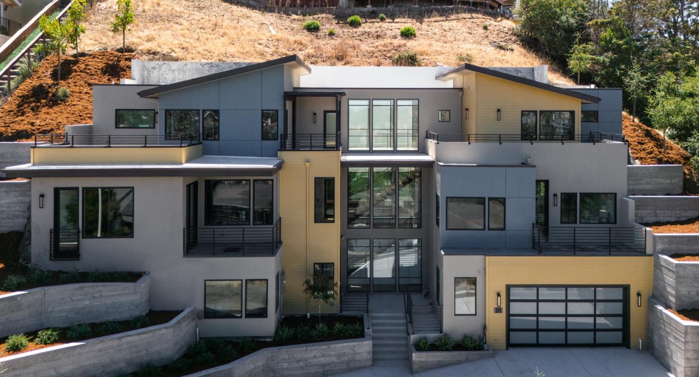 This just completed high-end contemporary masterpiece graces the San Carlos hills, strategically positioned to capture breathtaking canyon views and vistas of the illustrious San Francisco skyline. Across three thoughtfully designed stories, accessible by an elevator, this home exudes contemporary luxury. 4 bedrooms, each with en suite bath, plus office and 2 half-baths. Entry-level recreation room with a focal point linear gas fireplace outlined to the ceiling in textured tile. The great room features double glass doors to a front view terrace, a single glass door to a balconette. The fully open kitchen features wood grain cabinetry, including island topped in polished and veined black marble, perimeter quartzite counters, and a walk-in pantry room. Viking appliances include gas range, microwave, dishwasher, and built-in refrigerator. Top level primary suite with glass door to a spacious front view balcony, customized walk-in closet, and en suite bath with dual-sink vanity, free-standing tub with San Francisco city views. Attached 2-car garage wired for EV charging and significant additional off-street parking. Excellent San Carlos schools.