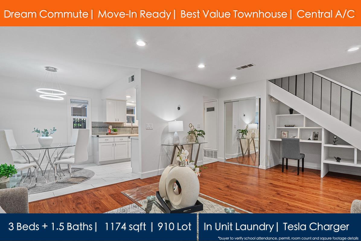 Charming Fully Upgraded 3-Bedroom Townhome in Prime Sunnyvale Location! This beautifully updated 3-bedroom, 1.5-bathroom townhome offers modern living at its finest. The home features a stylish kitchen with shaker cabinets, sleek quartz countertops, and functional stainless steel appliances. The recently remodeled bathroom boasts a custom vanity, while new laminate flooring flows throughout the space, complemented by recessed lighting, upgraded light fixtures, new baseboards, and fresh interior paint. Additional highlights include central forced air heating and air conditioning for year-round comfort, in-unit laundry, and a spacious private patio perfect for outdoor relaxation. The property also includes two parking permits, one with a designated carport space, and is equipped with a 200V EV charging power outlet. Residents can enjoy the community amenities, which include a pool and clubhouse. Prime location offers easy access to Ponderosa Park, downtown Sunnyvale, Caltrain, and many high-tech companies.