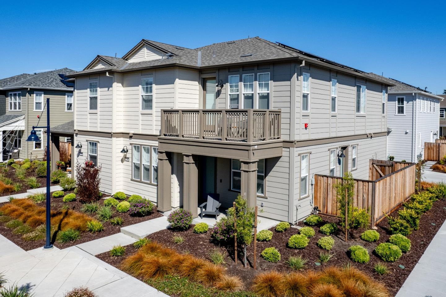 This almost new plan-4 Sea House is loaded with luxurious upgrades, has a balcony and is situated on a premium corner lot. The home is in pristine condition from beautifully engineered hardwood flooring to soft-close cabinets and drawers throughout. The kitchen is a stunning success with top of the line KitchenAid appliances, waterfall island with quartz counter-tops and full backsplash, dove gray cabinetry with upgraded hardware, under cabinet lights, six GFI outlets on the backsplash, basket weave pendants, upgraded plumbing fixtures, and an undermount Kohler Vault sink for easy cleanup. Architecturally, the smart home styling is modern and bright with square edge interior walls, frosted front and side yard doors, upgraded baluster handrails, abundant LED recessed lighting with dimmers, whole house fan, 3.15 kW solar (owned), Culligan soft water (owned), shutters and blackout blinds, and a sensibly finished and usable south-facing side yard. The nearby Shopping Centers includes restaurants, cinema, two fitness centers, one with pools, retail, and Trader Joes. Walk to the beach to view migrating whales and 900 acres of scenic coastal dunes, or hop on your bike to head down the nearby bike trails. Request our Features List for details of all the upgrades.