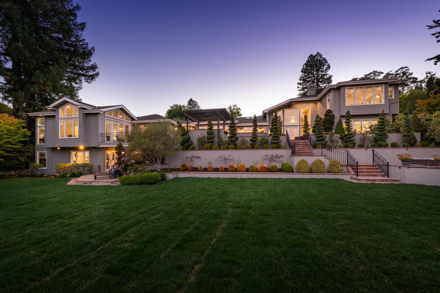 Regally situated on a .59-acre lot with breathtaking Bay views, this stunning +/-5,000 sq. ft. residence offers 5 bedrooms and 4.5 baths, blending luxury and warmth in a seamless, sun-drenched floor plan. Highlights include an impressive living room with floor-to-ceiling windows that frame the incredible views and French doors that open to the exceptional rear grounds, a large formal dining room, chefs kitchen/family room ensemble with island and breakfast nook, and French doors that access a vast terrace and the amazing grounds. 3 bright bedrooms with 2 bathrooms plus 2 powder rooms complete one wing of the main level. Upstairs features a sizable primary bedroom retreat with wall-to-wall windows that capture spectacular views, built-in cabinets, fireplace, 2 walk-in closets, spa-like marble bath, and a laundry closet. The substantial 5th bedroom wing includes a great room, full bath, rear patio access, lower-level gym/office, and large wine room--the perfect place for guests or recreation. Outside, the majestic grounds offer elegant & lush landscaping, meandering pathways, incredible vistas, large patios, outdoor kitchen, firepit, sweeping level lawns, fountain, rose garden, and a putting green. Completing this showcase home is an attached 3-car garage and a large laundry room.
