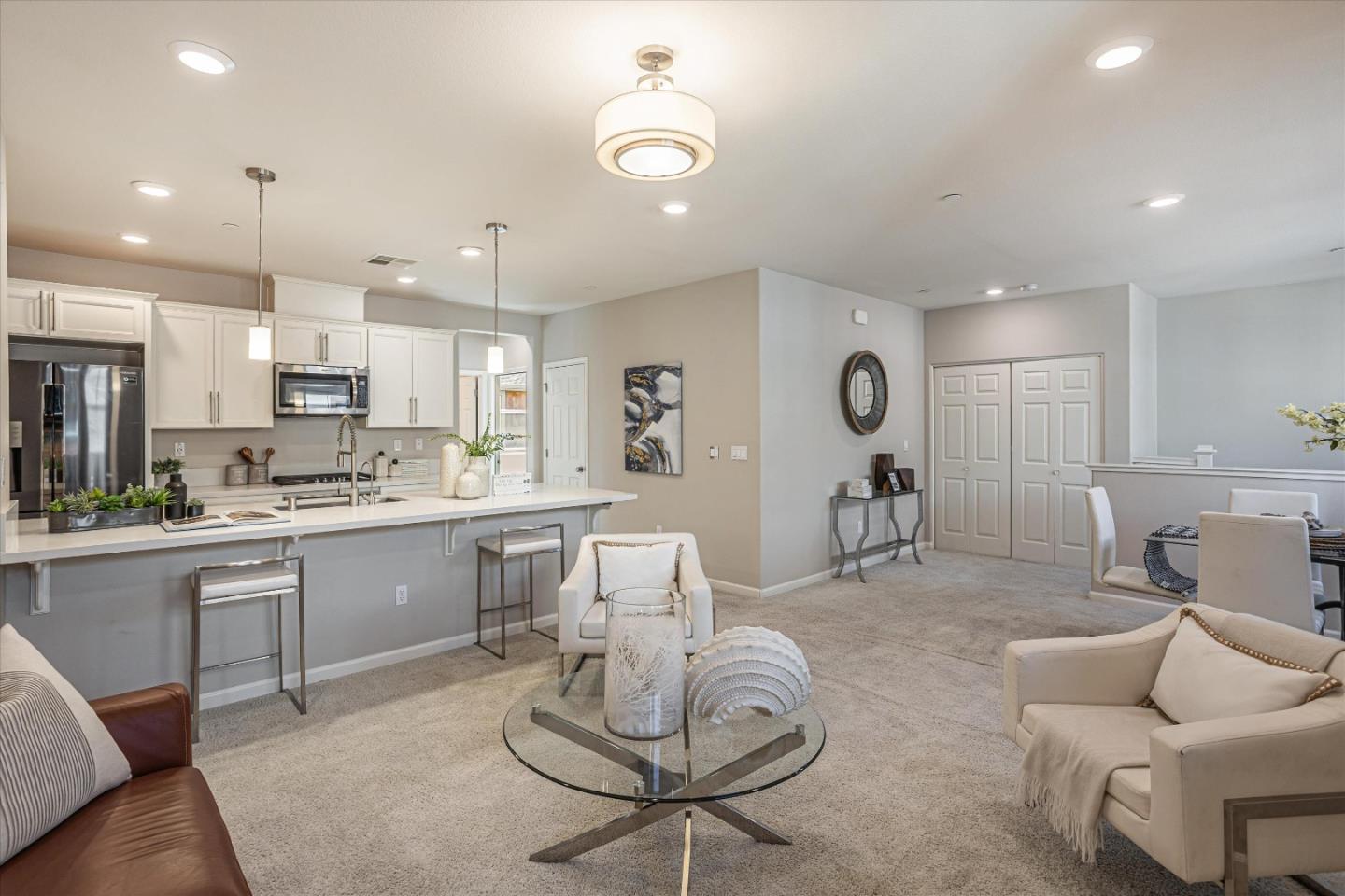 This beautifully maintained single-level home, built in 2017 by KB Homes, features an open floor plan with all living areas conveniently located on the same level, providing added privacy with no upstairs neighbors. Thoughtful upgrades include high ceilings, recessed lighting, and large windows that fill the home with natural light. The modern kitchen boasts custom cabinets, quartz countertops, stainless steel appliances, and a spacious island with a sink. The primary suite includes a walk-in closet and double vanity. Enjoy outdoor living on the private patio, and benefit from the attached 2-car side-by-side garage with additional storage. Located in a newer, well-developed community, this home is within walking distance to parks, Safeway Market Plaza, Costco, H Mart, Ranch 99, and dining options. With easy access to the Berryessa BART Station, VTA, and major highways (680, 880), as well as tech hubs like Amazon and Google, this home is perfectly positioned. Plus, its close to the highly rated Vinci Park Elementary School (9/10 *test score GreatSchools). Low HOA fees make this home a great value. Don't miss the chance to make it your own!