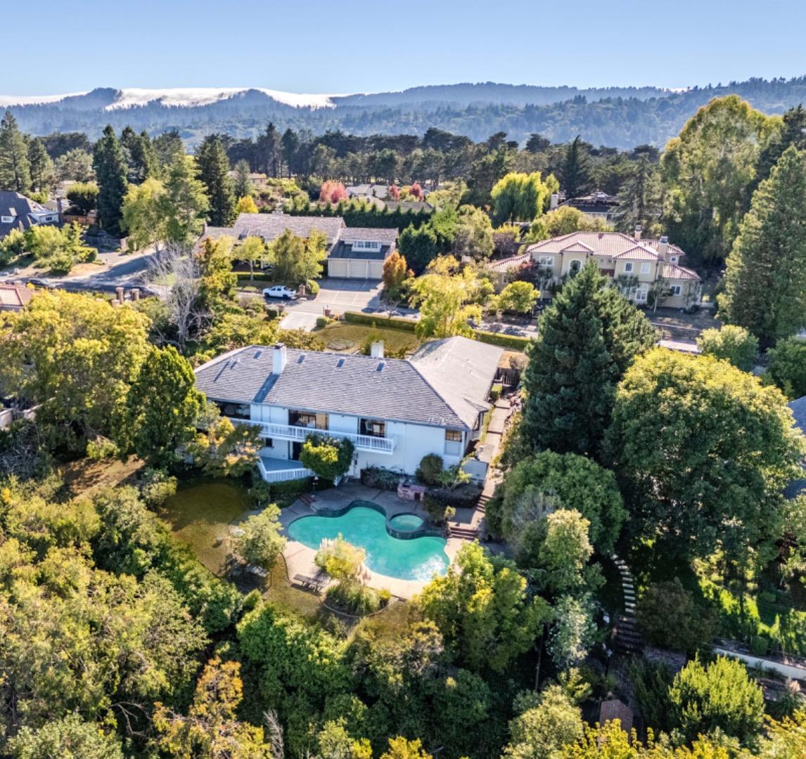 A rare find in Skyfarm Hills, this home offers stunning views of the San Francisco Bay and luxurious living. This exquisite 4-bedroom, 4-bath residence features an inviting formal living room with a cozy fireplace, a formal dining room with custom wainscoting, and a spacious kitchen that seamlessly connects to a wood-paneled family room. The main level master suite boasts breathtaking views from its private balcony, while two additional bedrooms and a full bathroom add convenience. Downstairs, enjoy a recreation room with a wet bar and an additional bedroom suite. The outdoor space features a sparkling pool and lush yard, all set against a picturesque backdrop. Conveniently located between San Francisco and Silicon Valley, this exceptional property is your perfect sanctuary in Skyfarm Hills.