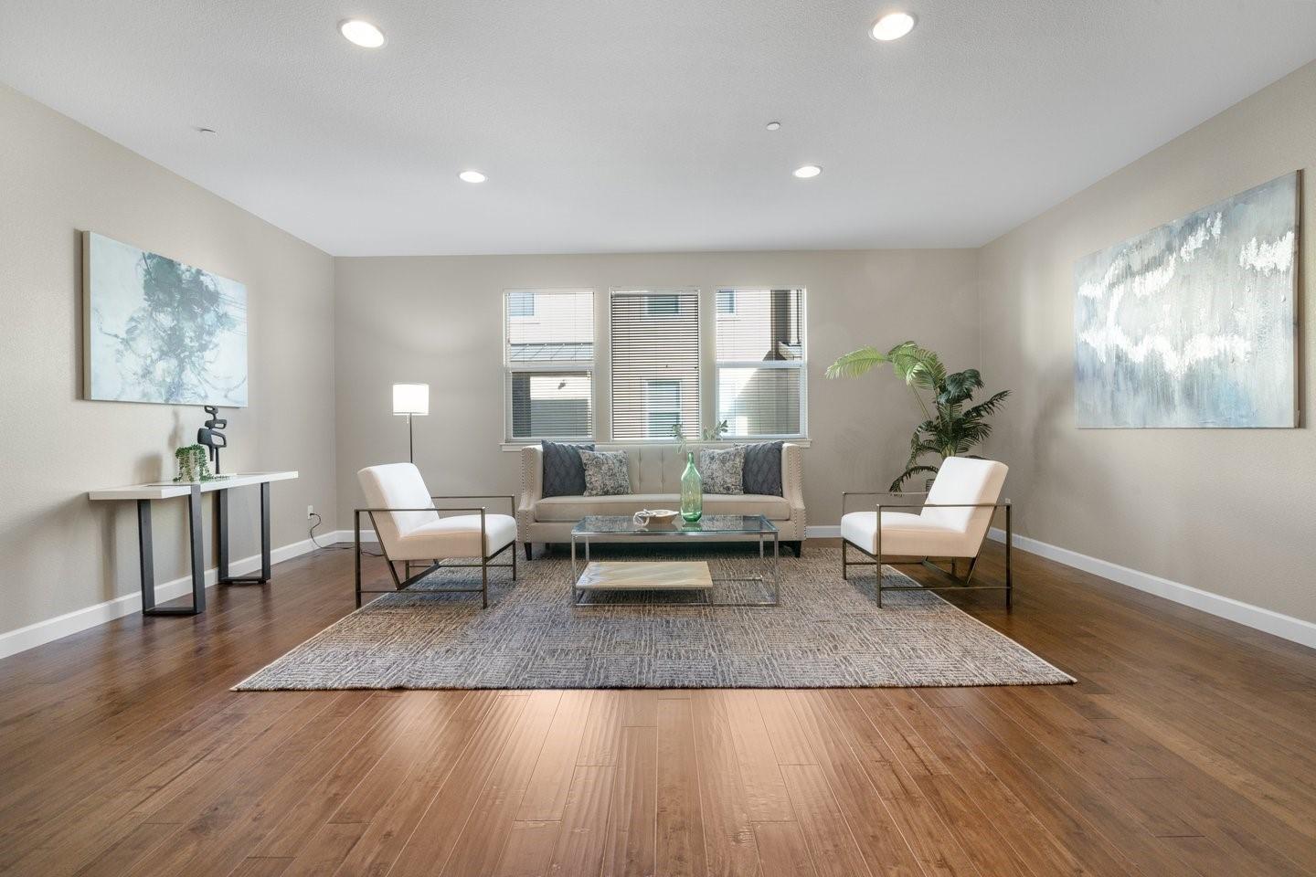 Move in and enjoy this gorgeous 4 bedroom townhouse built in 2011 in Sunnyvale. Modern and luxurious throughout. Ground floor primary suite with full bathroom including walk-in shower. Large open dining and living area with huge windows. Spacious open kitchen with gorgeous countertops, breakfast bar, stainless steel appliances and study nook. All four bedrooms are spacious. All 3.5 bathrooms are beautiful. Large upstairs primary suite includes a generous walk-in closet and attached bathroom. Dual zone central air conditioning. Inside upstairs laundry. Recessed lighting. Two patios. Nestled in a quiet interior spot within the community. Near many technology company campuses. Convenient commute location with easy access to freeways and expressways.