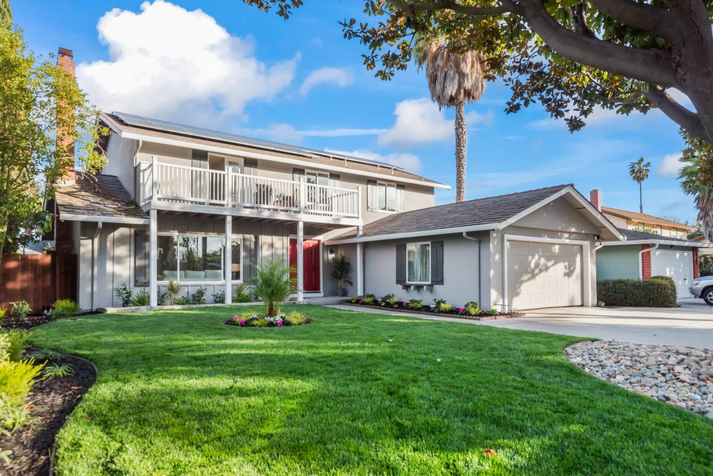 Lovely curb appeal with stately trees & inviting red door. Enter to a spacious floor plan featuring a combination of sparkling refinished hardwood & functional LVT floors! The updated kitchen is perfect for preparing meals with attractive quartz countertops & ample storage including island! Enjoy your meals in the breakfast nook, separate dining room, living room with cozy fireplace, or separate family room that boasts a wet bar! Each bedroom has a unique feature sure to delight such as under-window cutout perfect for reading, double closets, & access to large balcony. The functional garage includes built-in storage & sauna for ultimate relaxation! Plus, owned solar panels! In the generous backyard, enjoy the Bay Area's beautiful year-round weather with two charming seating areas, stunning tree, verdant lawn, & colorful flowers. Convenient location with proximity to major thoroughfares; high-end amenities; & lovely public parks including Las Palmas Park with lighted pickleball & tennis courts, two dog parks, & much more! Students have access to excellent public schools in Cumberland Elementary, Sunnyvale Middle, & Fremont High (buyer to verify) plus top private K-8 Challenger School is nearby!
