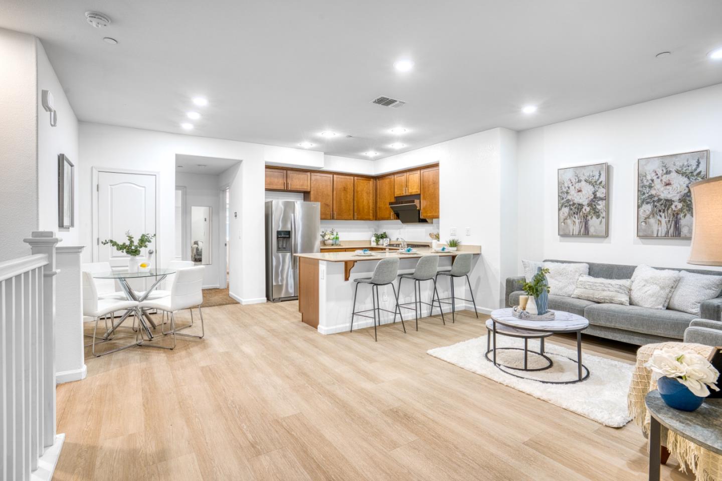 This stunning corner-unit condo offers modern style, comfort, and convenience in a prime San Jose location. The highly desirable layout includes a private first-floor bedroom with a full bath perfect for guests or a home office. The chefs kitchen features stainless steel appliances, ample cabinetry, and a spacious island bar. Bright and airy, the home boasts double-pane windows, recessed lighting, and a cozy patio for outdoor relaxation. Upstairs, the primary suite includes a dual-sink bath and a walk-in closet, with wood flooring throughout all bedrooms. An attached two-car garage adds convenience. Steps from a new park, Townsend Park, and San Jose Municipal Golf Course, this home is also near top-rated Vinci Park Elementary, Berryessa BART, and major tech hubs like Google and Amazon. Shopping and dining options, including Safeway, H Mart, and Costco, are just minutes away.